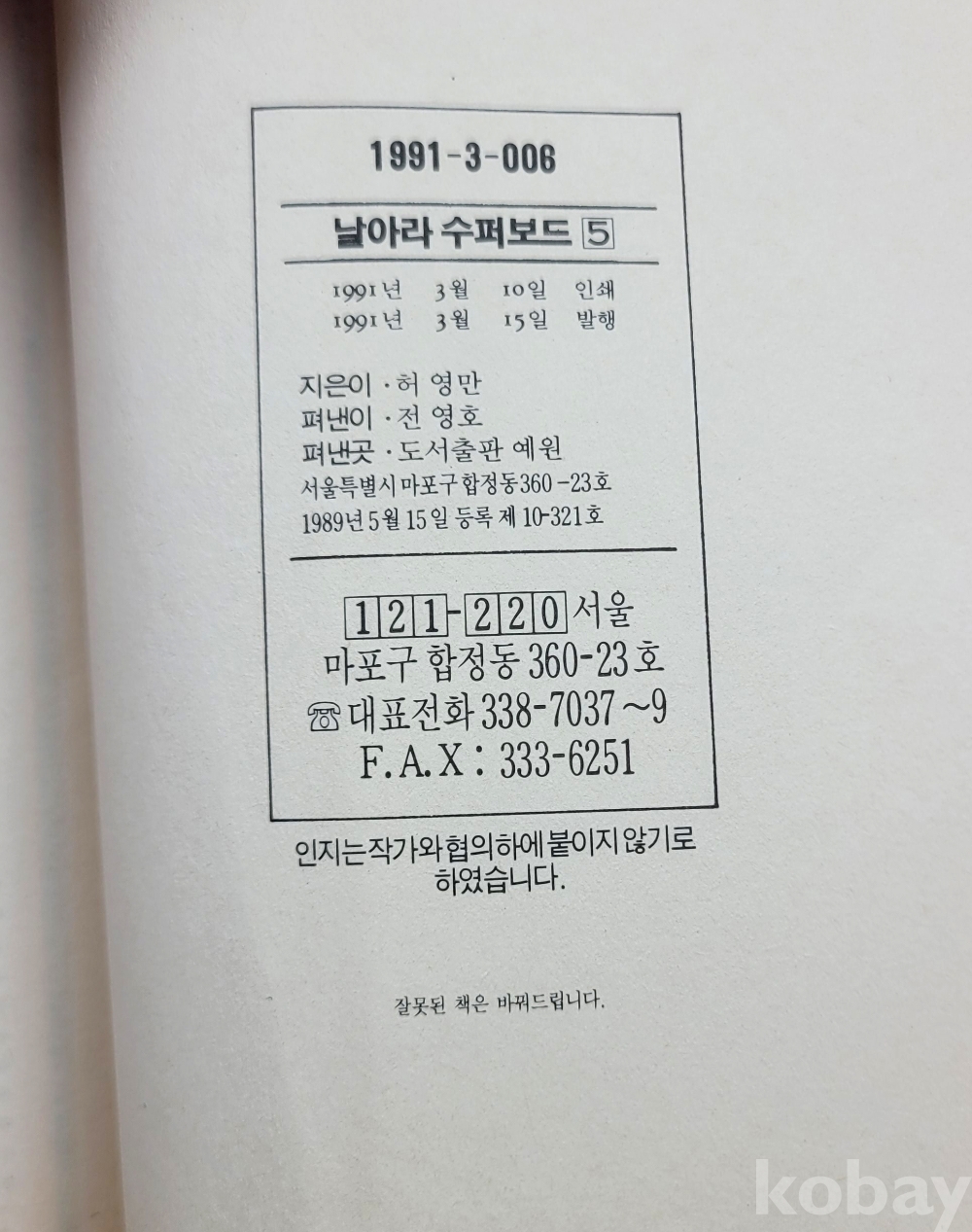 물 품 명 | [제로제로코믹스] 허영만 / 날아라 수퍼보드 제5권 / 1991년 초판 / 도서출판 예음 |