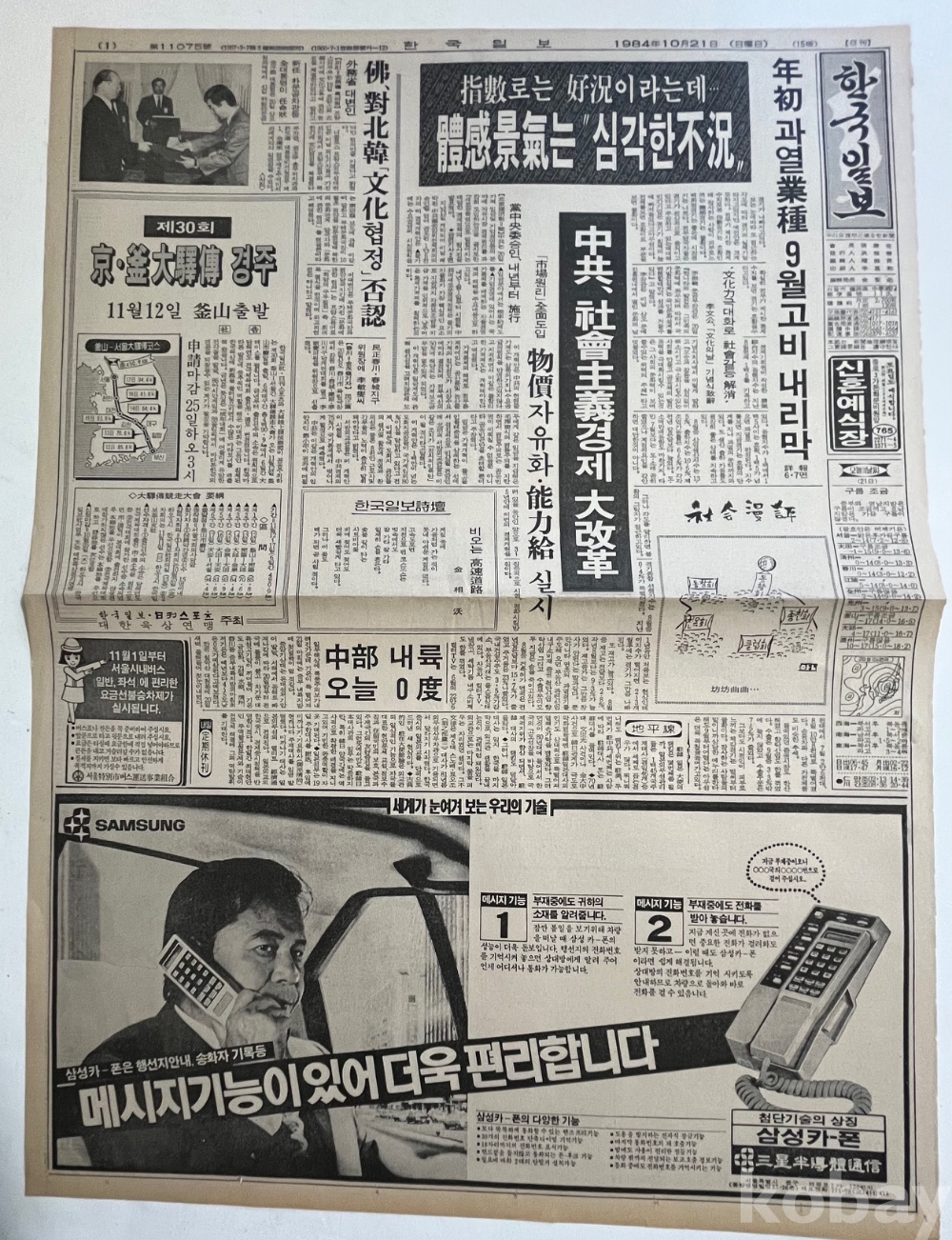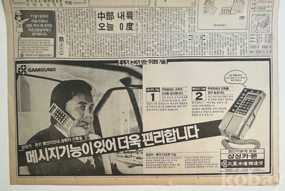 메시지 기능이 있는 삼성 카폰 광고가 실린 1984년 한국일보 낱장입니다.