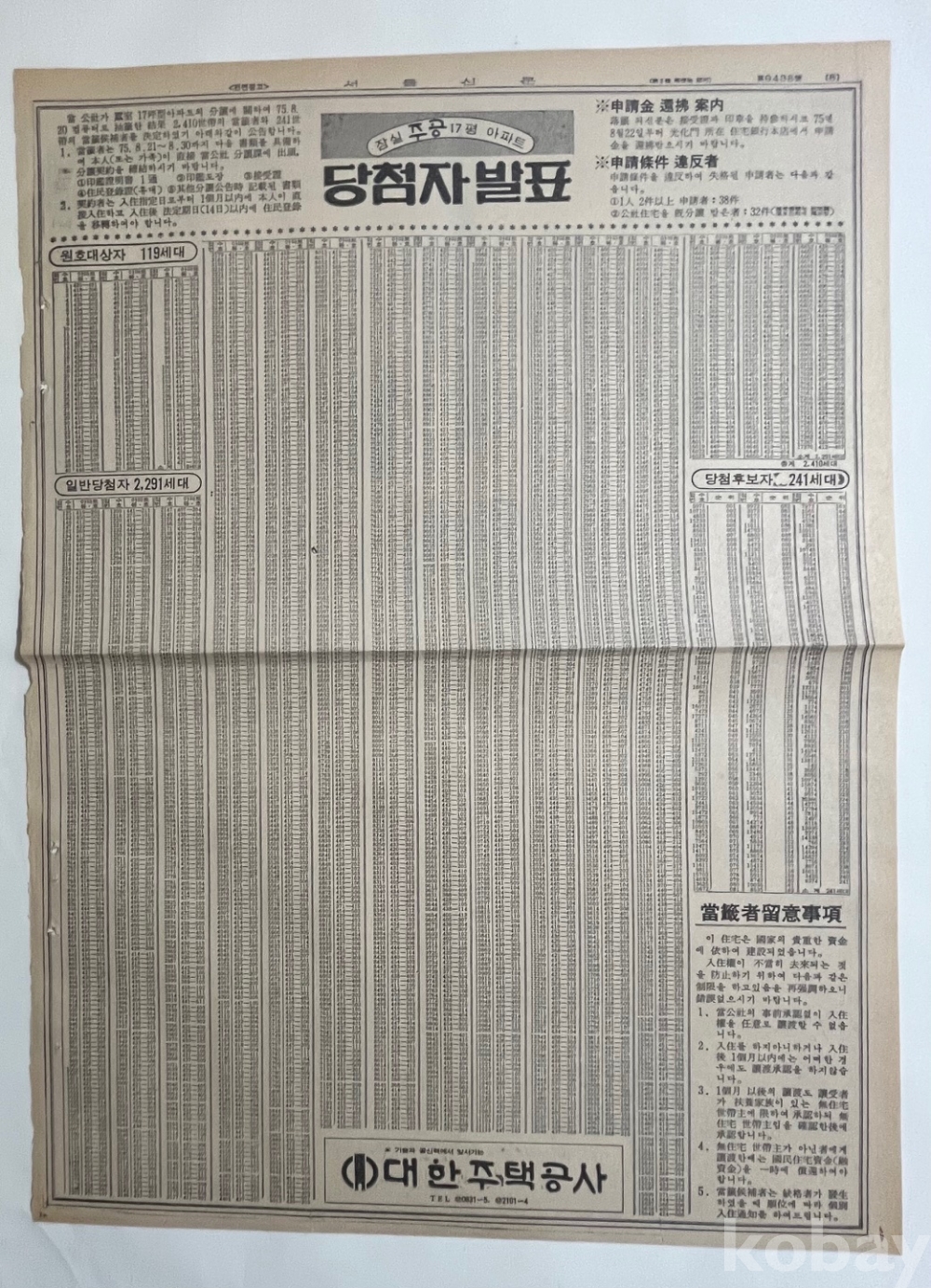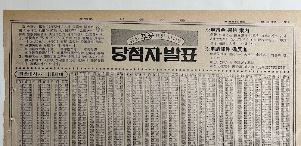 잠실 주공아파트 당첨자를 공고한 신문 전면광고입니다.