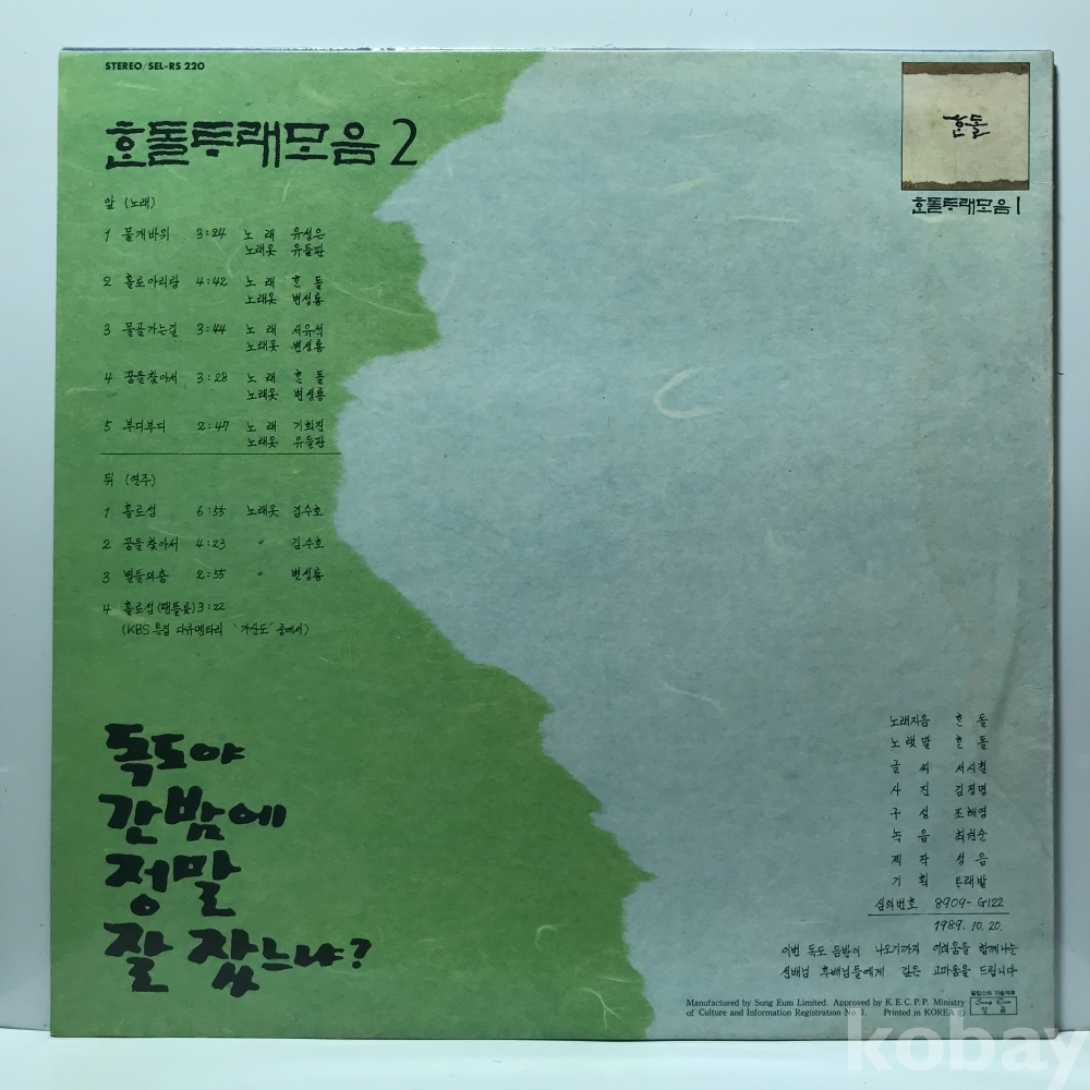 LP 36,650-76 한돌 타래모음 2 - 홀로 아리랑 . 89 성음 자켓 EX 알판 NM