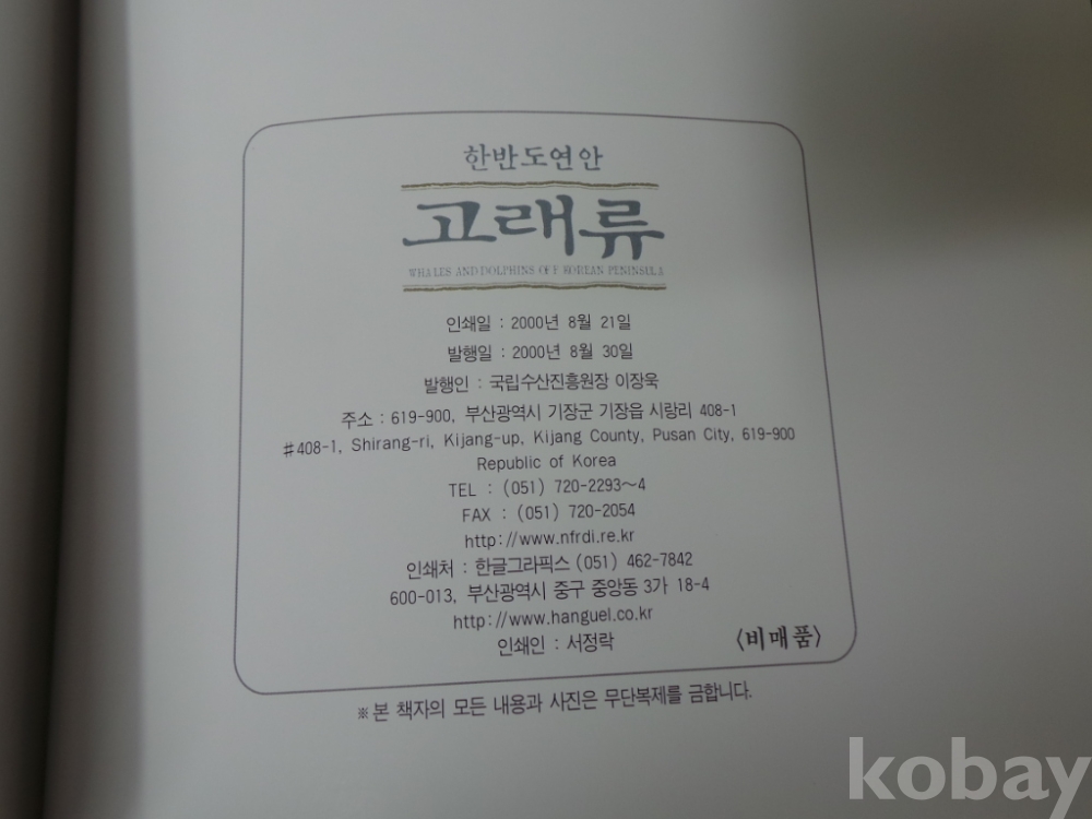 2000년도에 발행한 한반도 연안 고래류,책,비매품