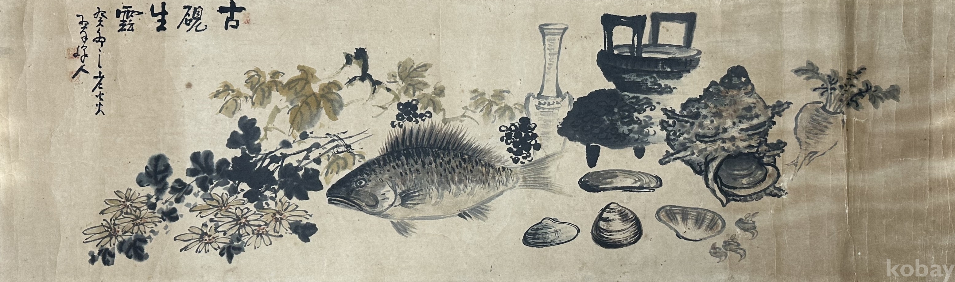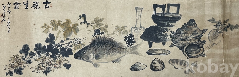 본 작품은 ‘古生趣(고생취)’라는 제목의 수묵채색화로, 물고기와 조개, 산호, 화병, 식물 등 자연의 소재를 함께 그린 정물형 동양화입니다. 화면 중앙에는 생동감 있게 묘사된 물고기가 위치하며, 그 주변을 둘러싼 조개껍질과 식물, 기물이 조화롭게 어우러져 자연의 풍요로움을 전합니다. 먹의 농담과 은은한 채색이 균형을 이루고 있으며, 섬세한 필선과 안정된 구성이 특징입니다. 상단에는 ‘古生趣(고생취)’라는 제명이 적혀 있고, 낙관이 함께 찍혀 있어 작가의 완성작임을 보여줍니다. 전체적으로 여백의 미와 담백한 색조가 어우러져 동양화의 정갈한 아름다움을 느낄 수 있는 작품입니다.