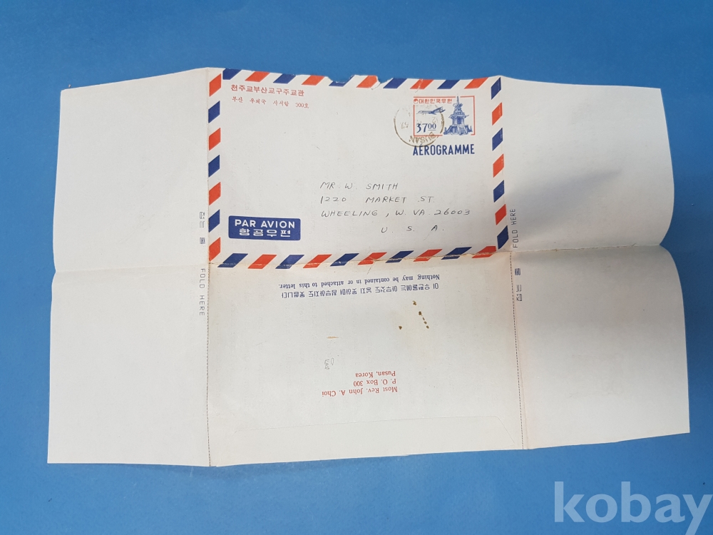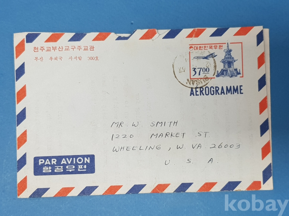 **** 1967년 37원 디보탑 항공서간 실체/BUSAN, 12,IV,67/천주교부산교구교관 발송