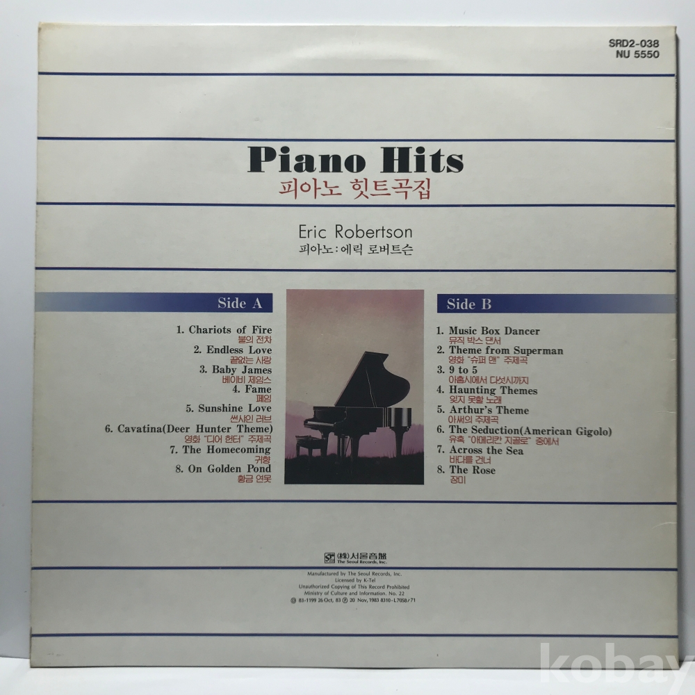 LP 82,350-73 피아노 힛트곡집 - 에릭 로버트슨 - 불의 전차/ 뮤직박스 댄서 . 자켓 EX+ 알판 EX+ 83 년제작 국내반