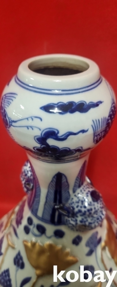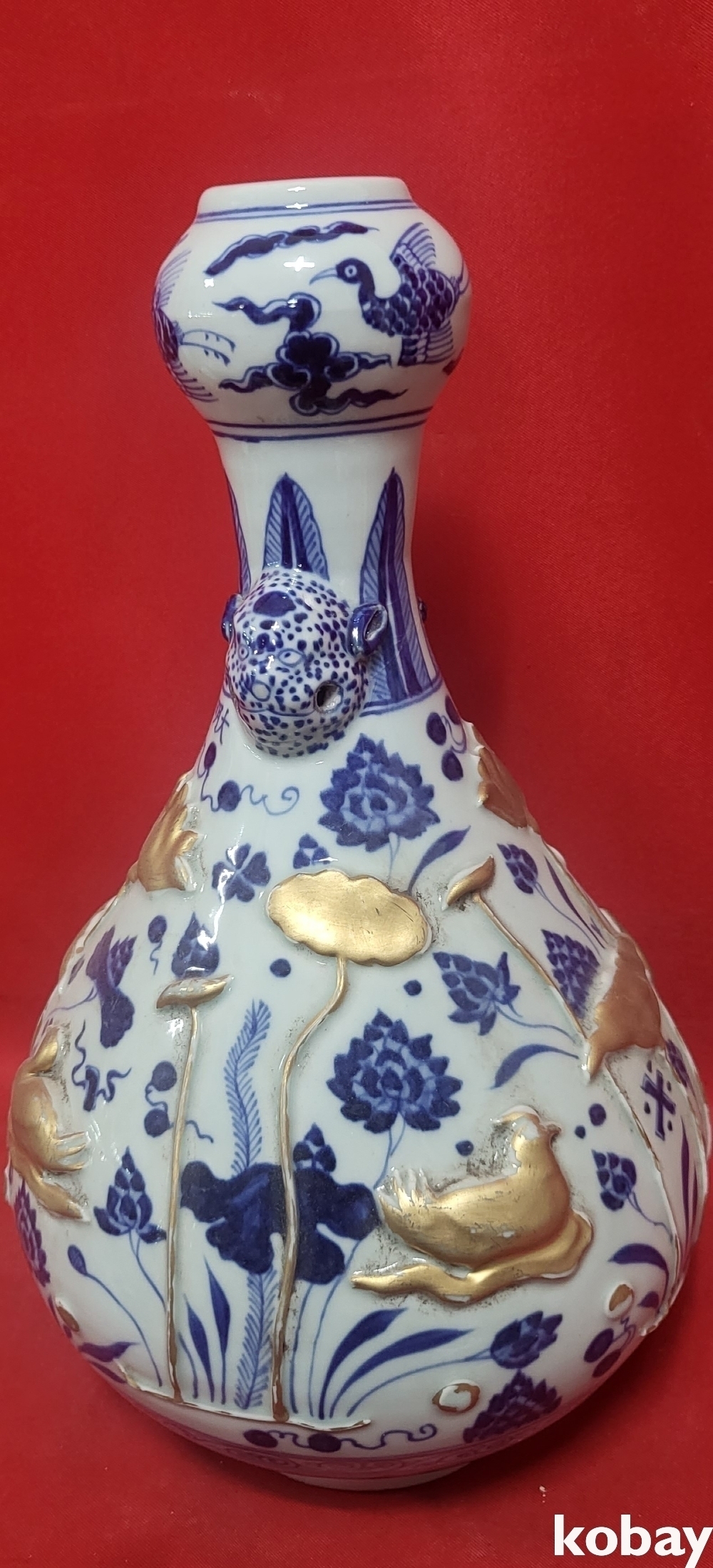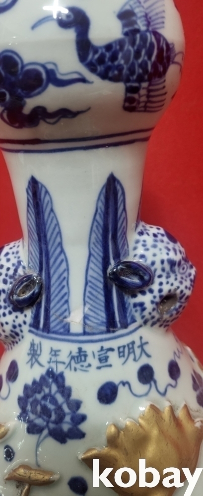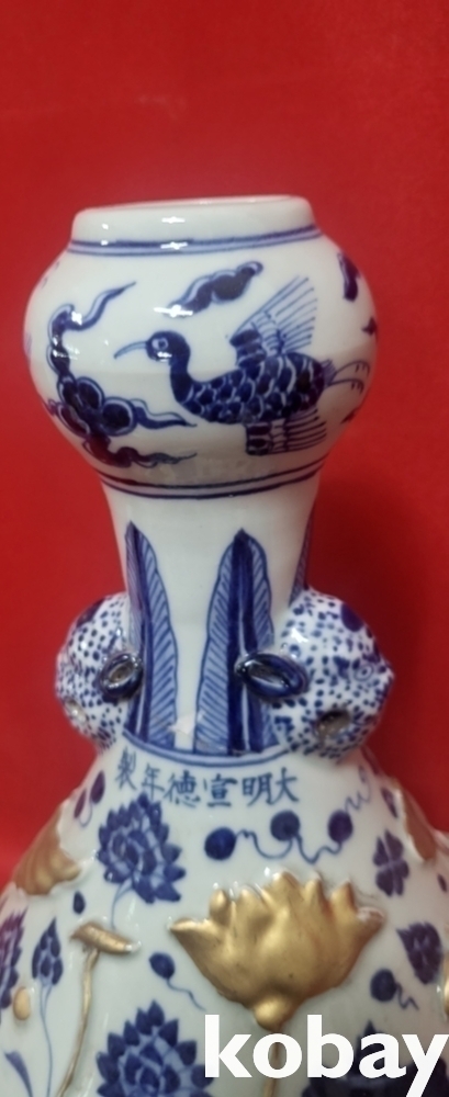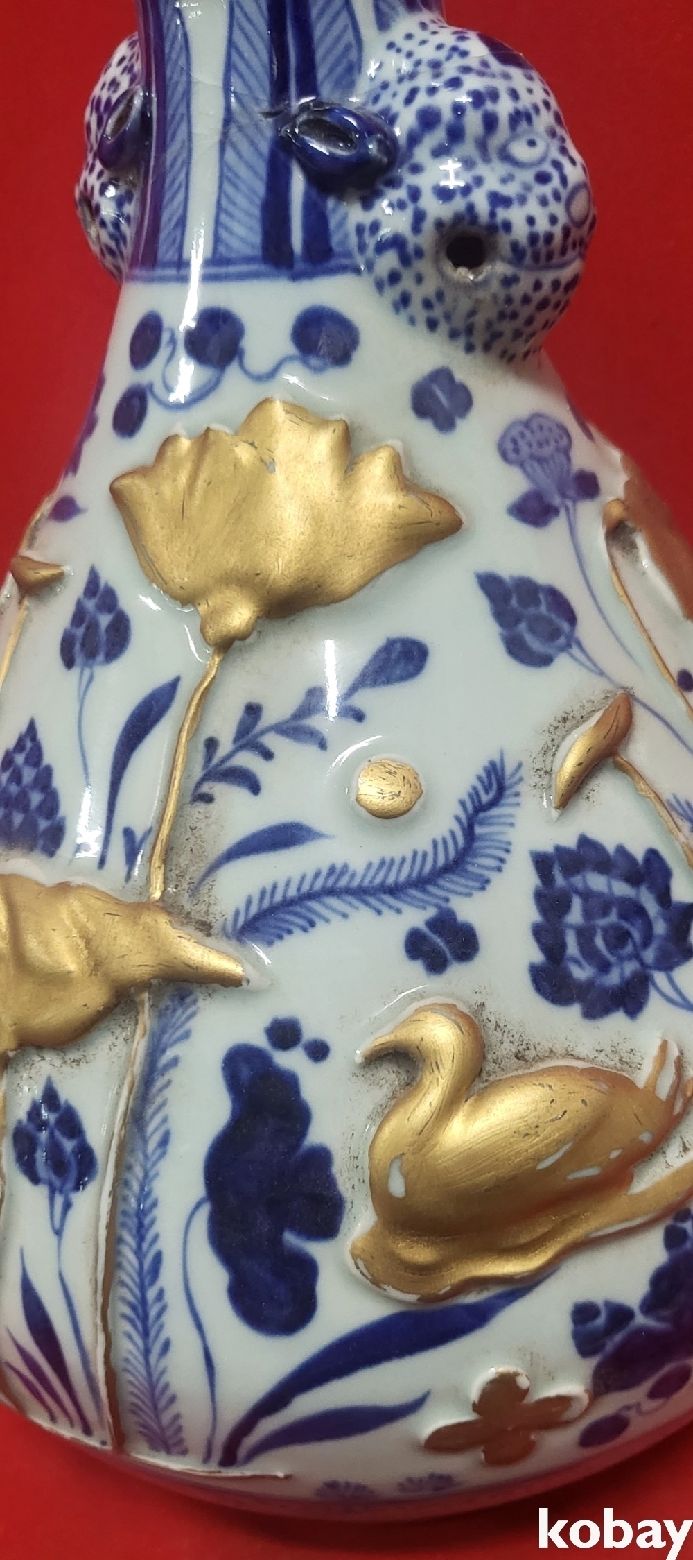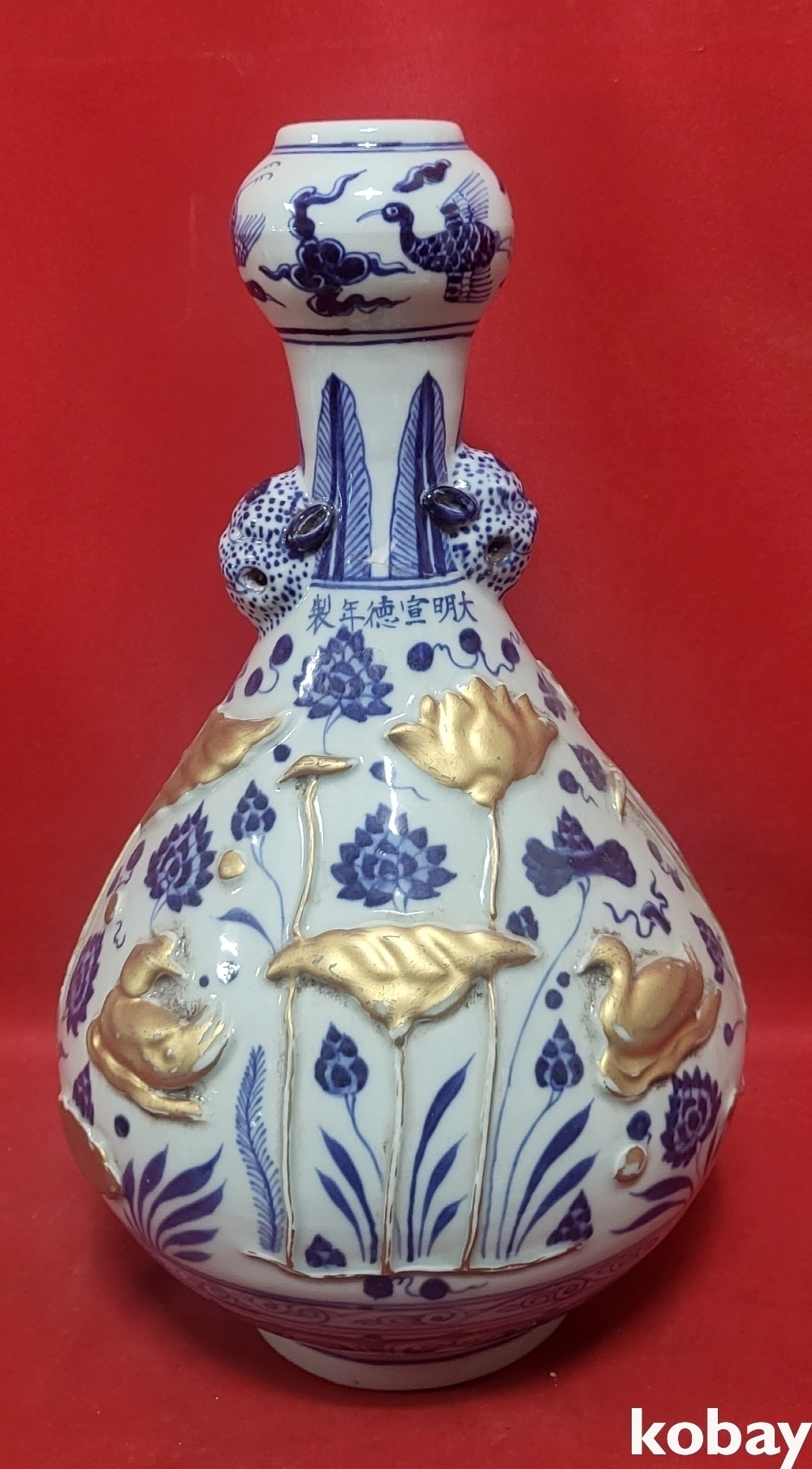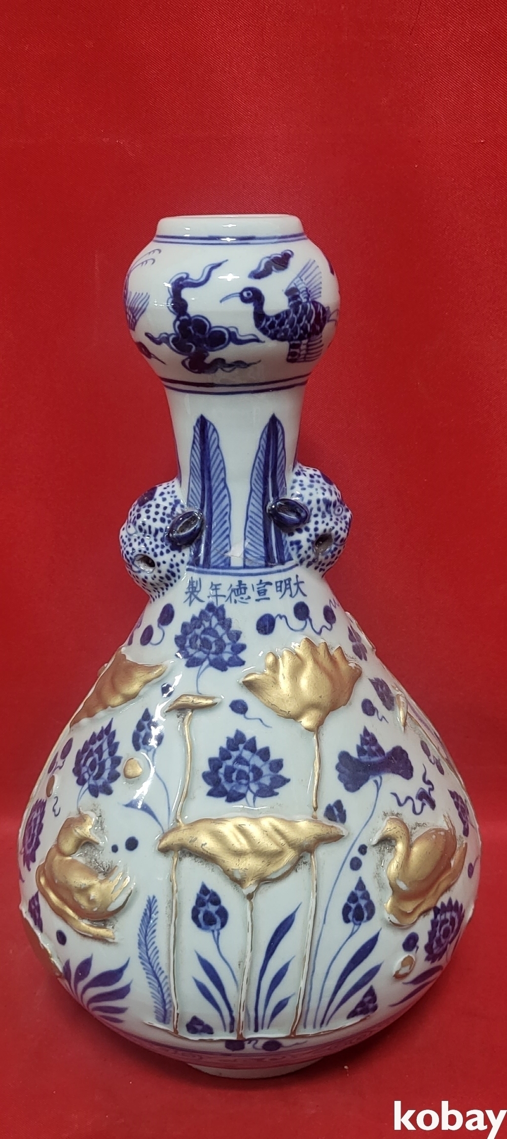 대명선덕연제 관지 금채 연꽃과 원앙새 문양 양이 소구병입니다,