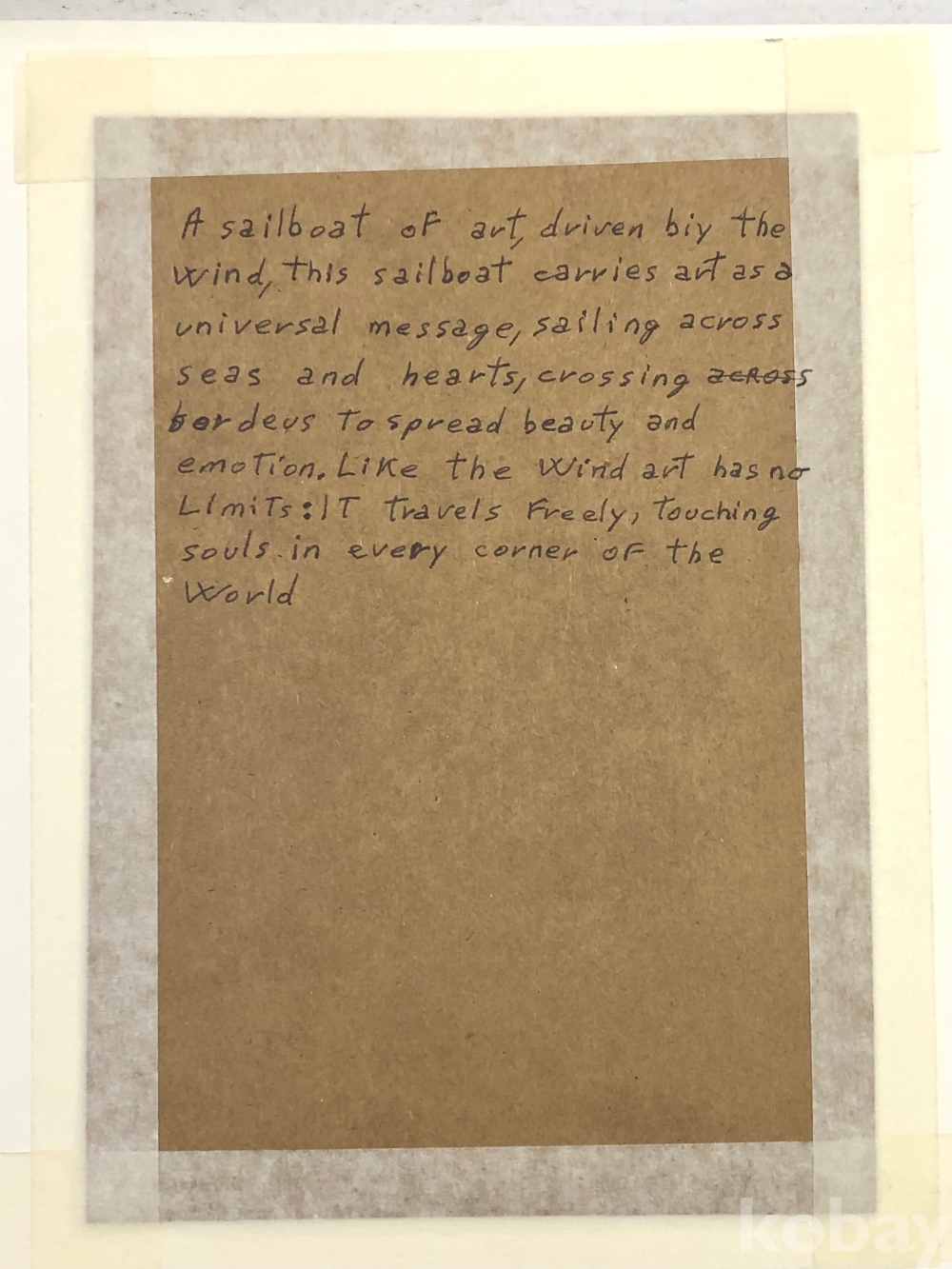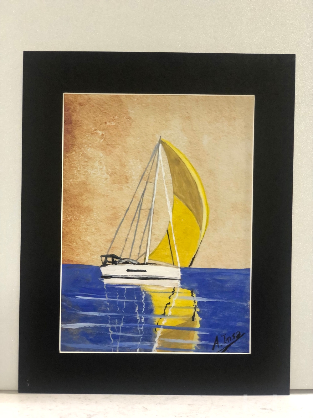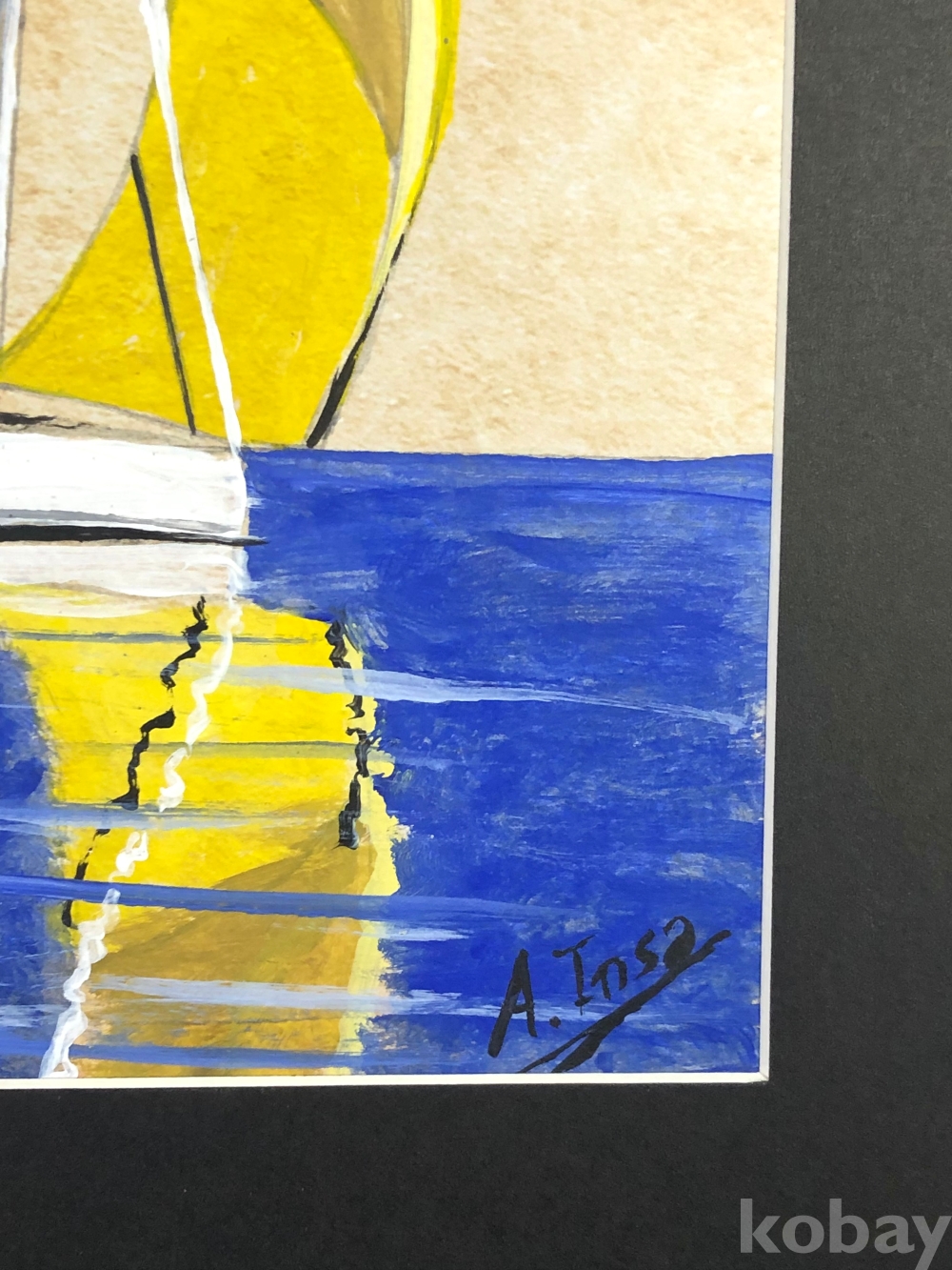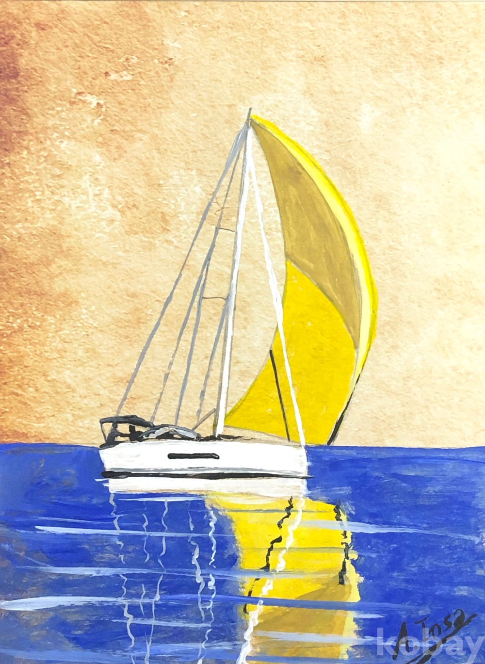 노란 돛을 단 요트가 평온한 바다 위에 머물러 있는 모습이며 따뜻한 색감과 푸른 바다 빛이 어우러지는 작품입니다.