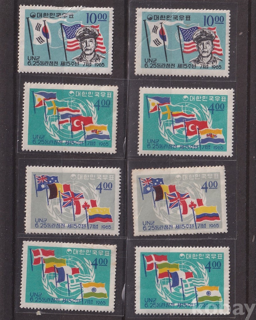 - 미사용 1965년 UN군 6.25동란참전 제 15주년 기념우표 4종 8매 세트