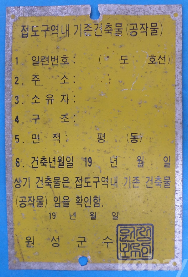 1960-70년대 접도구역내 기존건축물(공작물) 표찰 - 원성군