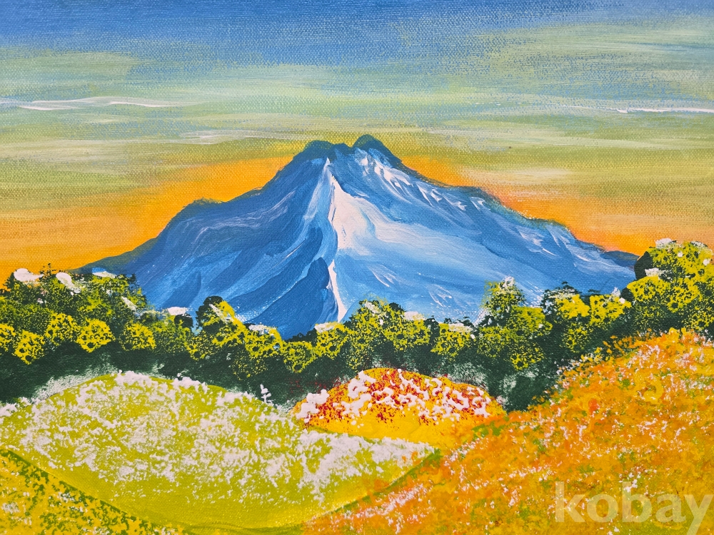 ‘한라산의 봄’은 제주의 상징인 한라산을 주제로 한 풍경화로, 봄철 유채꽃밭과 설산의 풍경을 따뜻한 색감으로 그려낸 작품이다. 노란 들판과 푸른 산, 초록빛 나무들이 어우러지며 제주의 계절적 생명력과 평화로운 정서를 표현하고 있다.