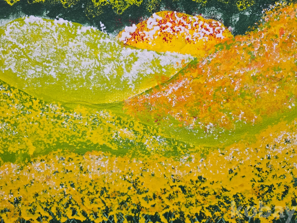 아크릴 물감을 사용해 밝고 채도 높은 색감을 구현했으며, 점묘와 질감 표현으로 화면의 입체감과 깊이를 살렸다. 전체적인 색의 조화가 안정적이며, 실물은 사진보다 더욱 선명하고 생동감이 돋보인다. 본 작품은 제주 현지에서 직접 구입한 것으로, 지역 풍경의 서정성과 감성을 잘 담아낸 작품이다.