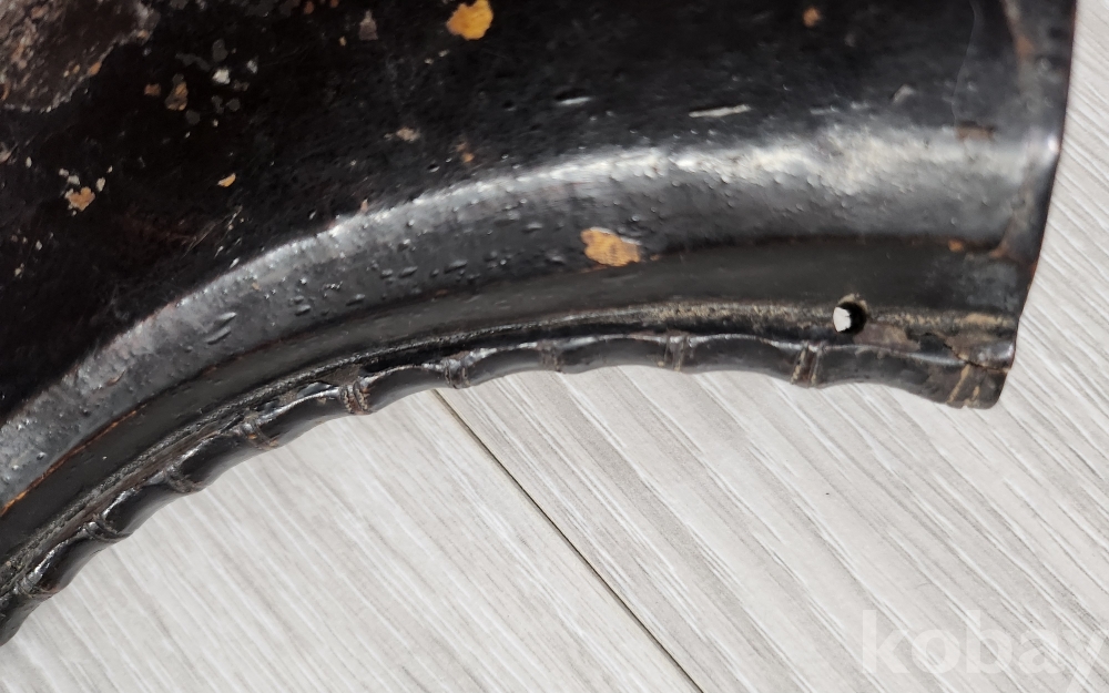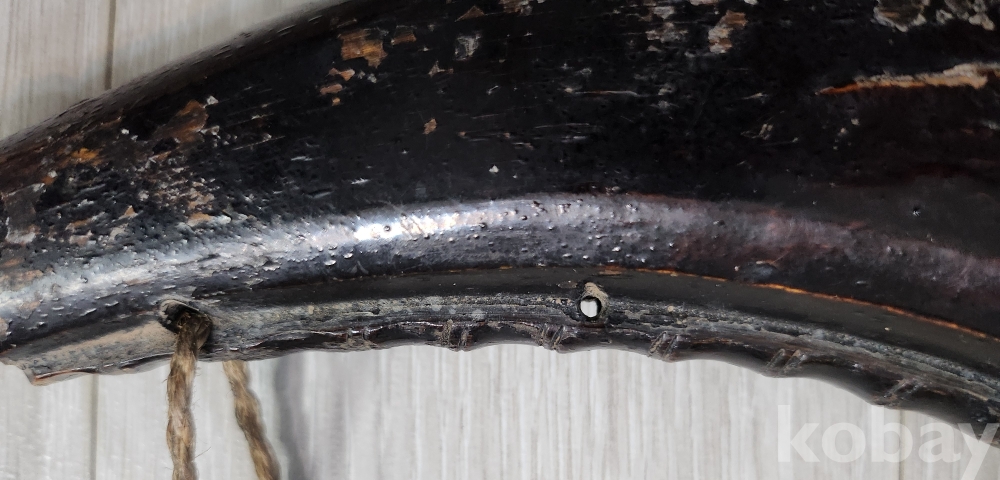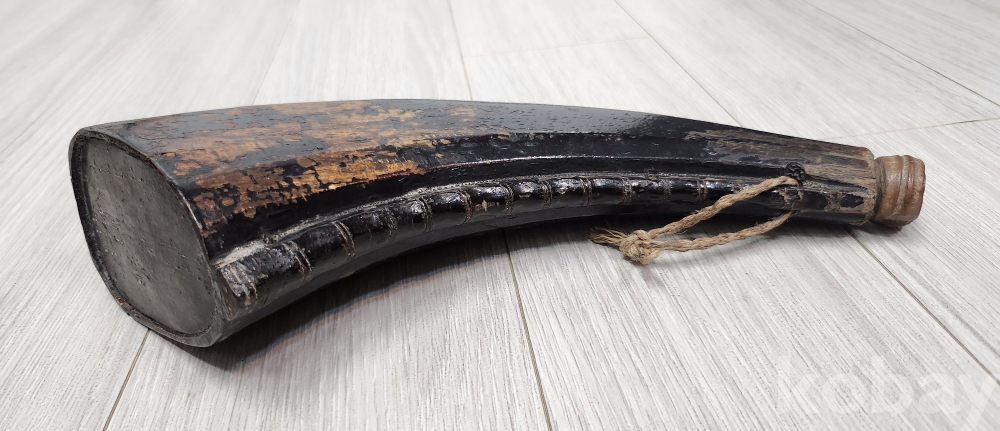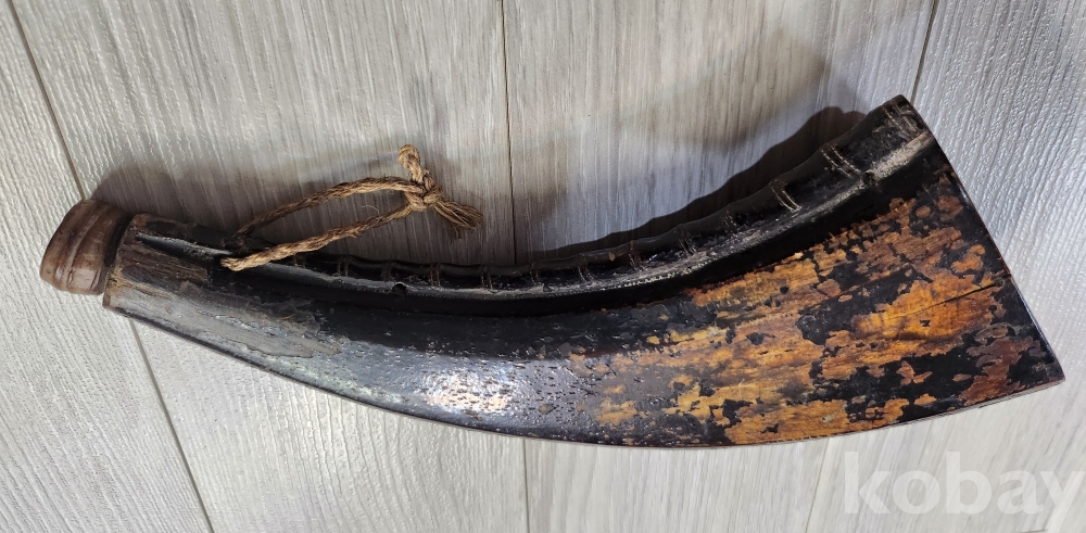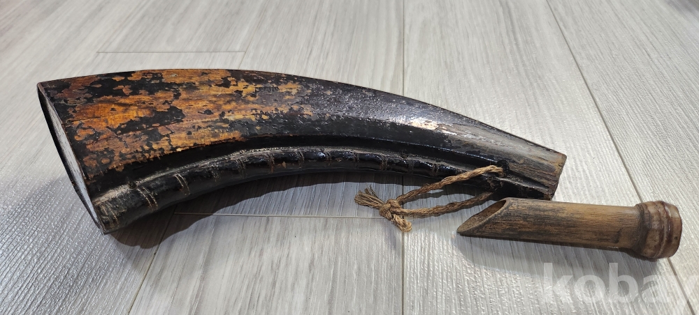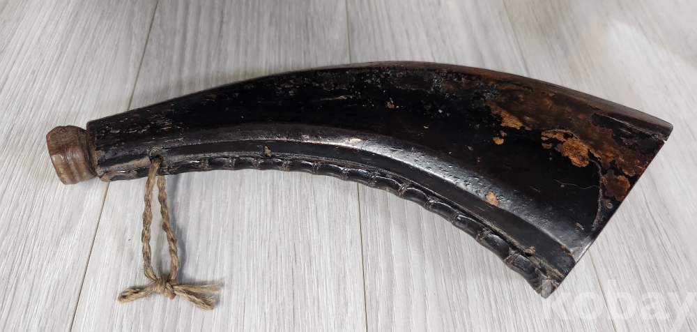 오래된 화약통 입니다 재질은 나무입니다 화약통 구부러진 안쪽으로 대나무 마디를 조각하여 멋스러움을 두었습니다 안쪽으로 끈을 묶을 구멍을 3곳두어 어깨에도 메고 다닐수 있게 만들었습니다 당대 옷칠한것 입니다 상태양호하나 사진 참조 바랍니다
