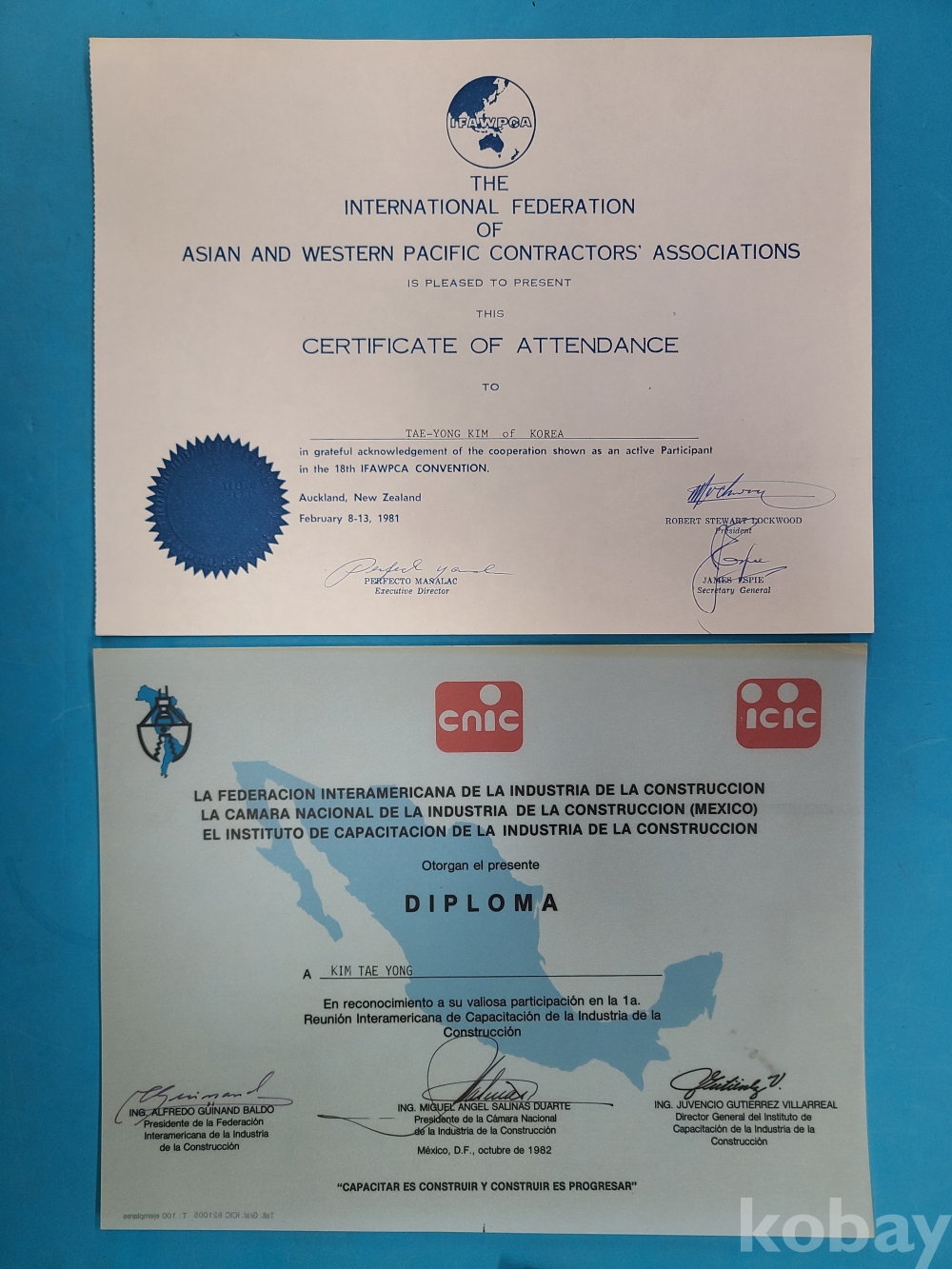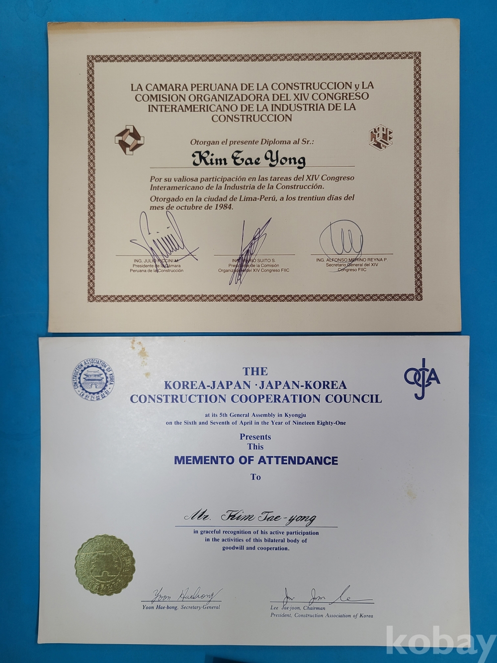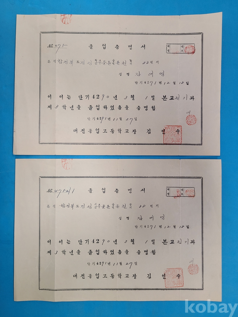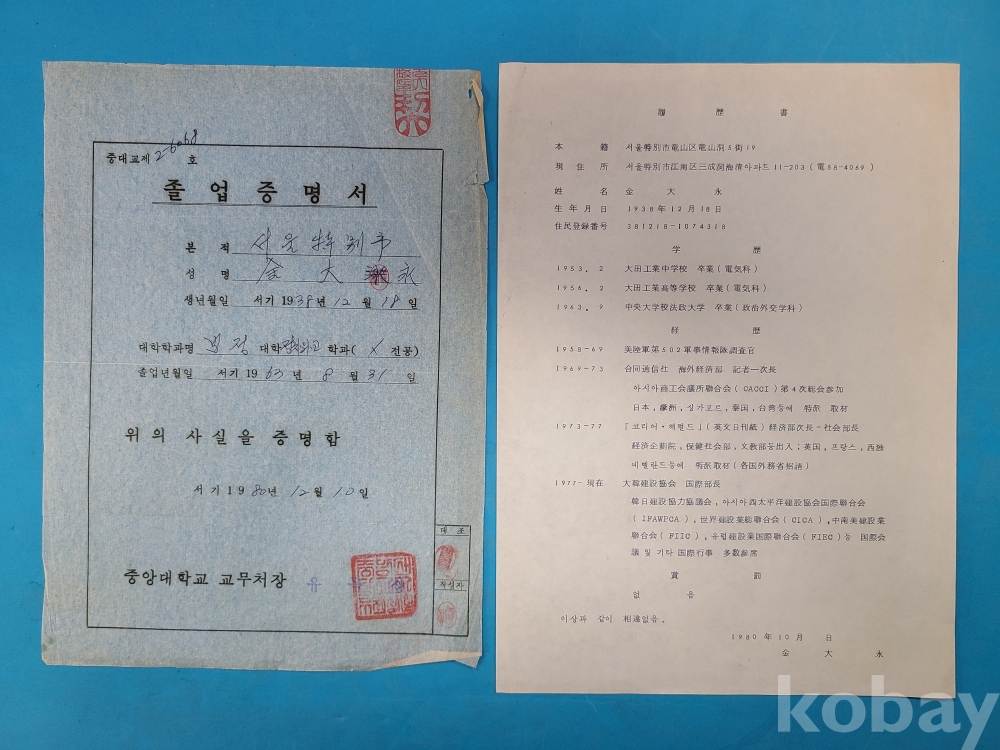 대전공업고등학교 졸업증명서(1958년),중앙대학교 졸업증명서(1980년)
