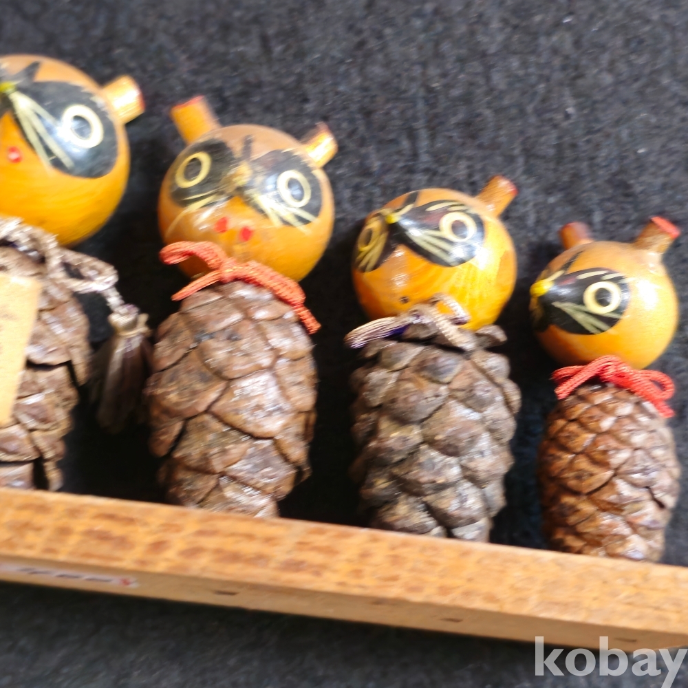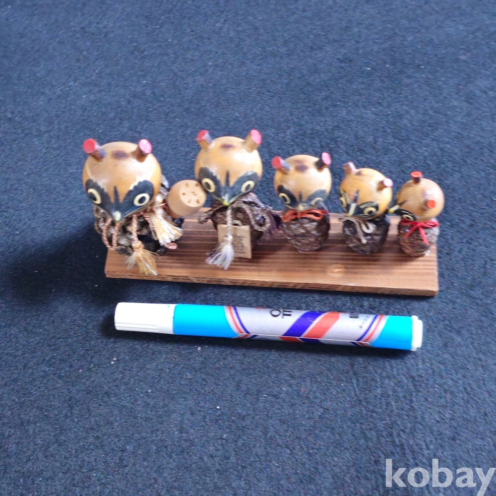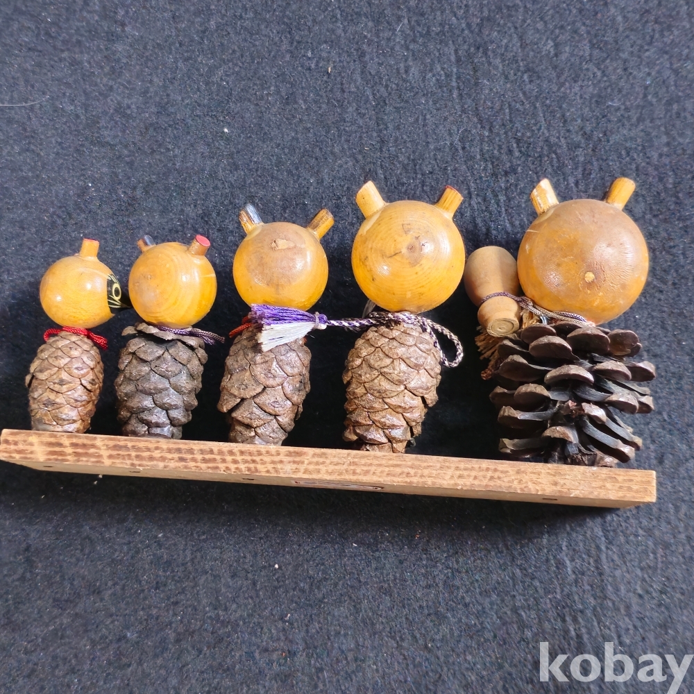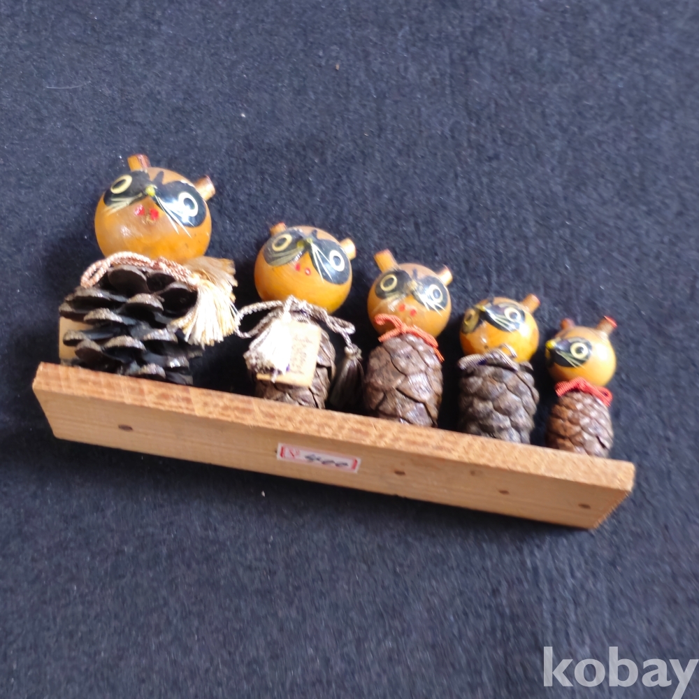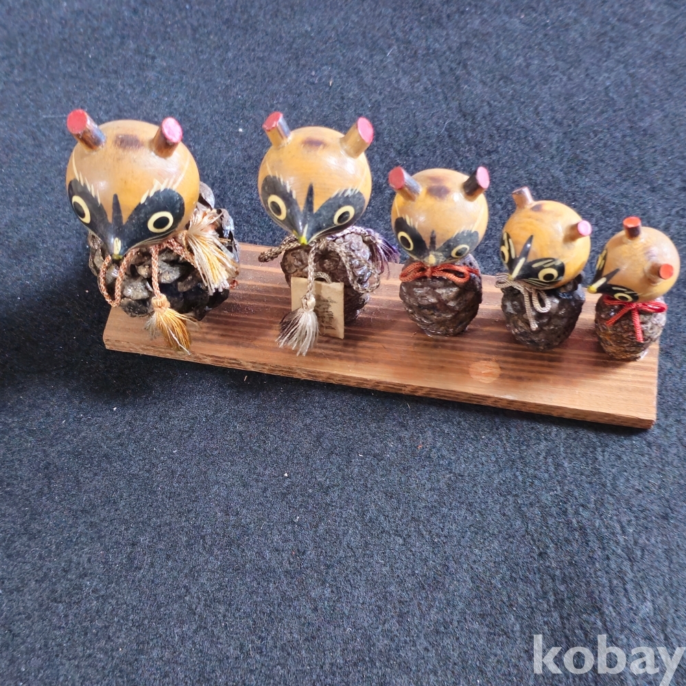 (((인테리어소품/목각인형))) 오래전 일본에서 솔방울과 목각으로만든 너구리 5마리 한가족 목각인형
