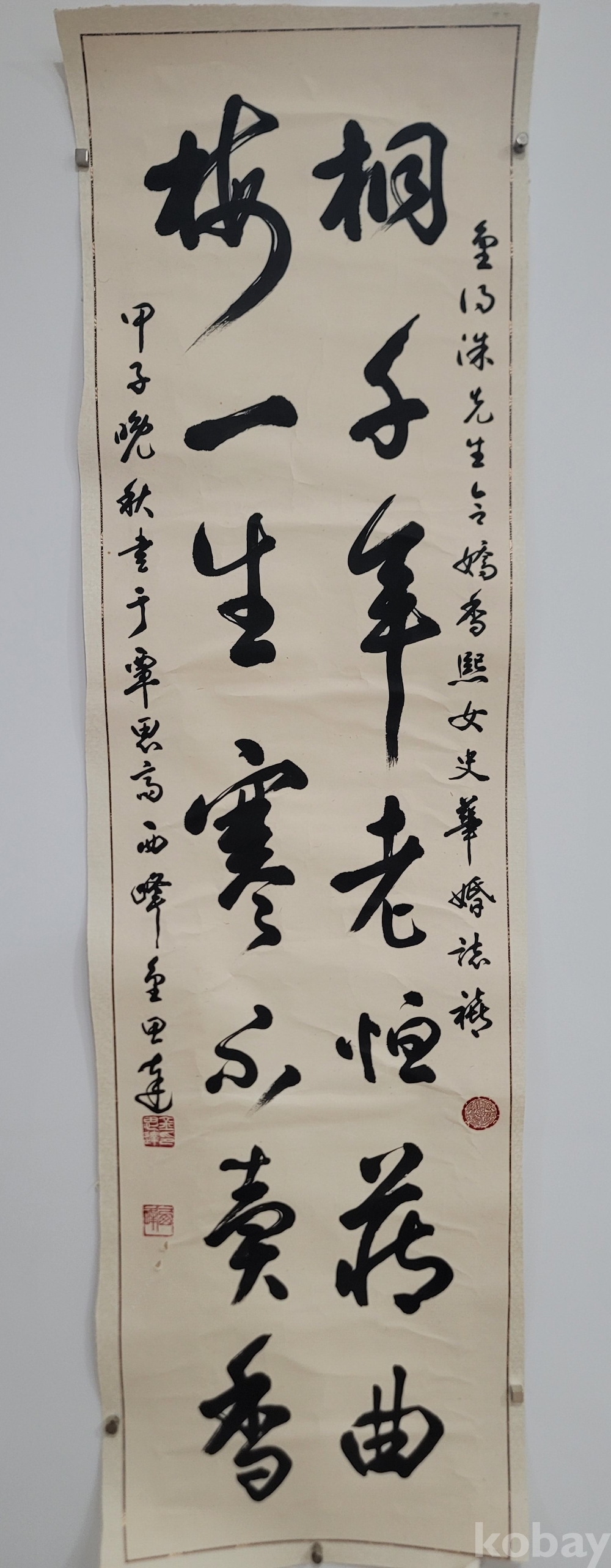 작품은 김사달 선생이 1984년 만추(晩秋)에 김득수(金得洙) 선생의 화혼(華婚)을 축하하며 담사재(覃思齋)에서 쓴 글씨이다.