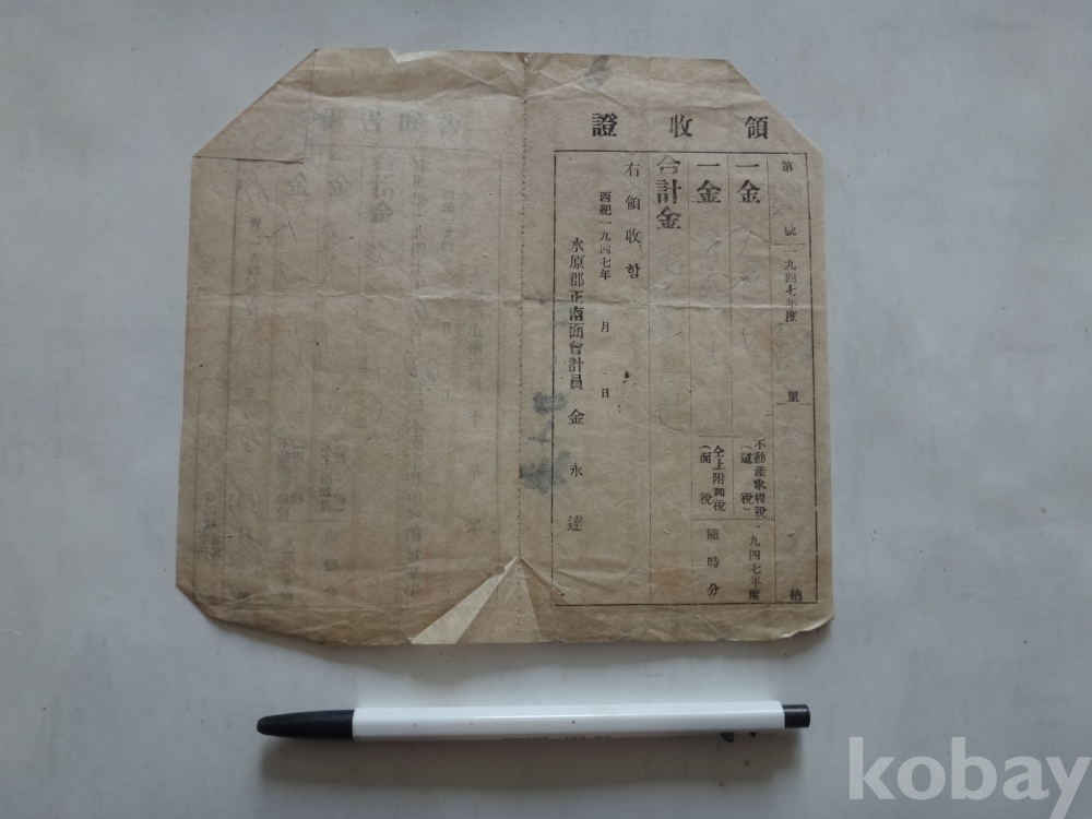 수원군 정남면 - 부동산취득세 영수증 (1947년)