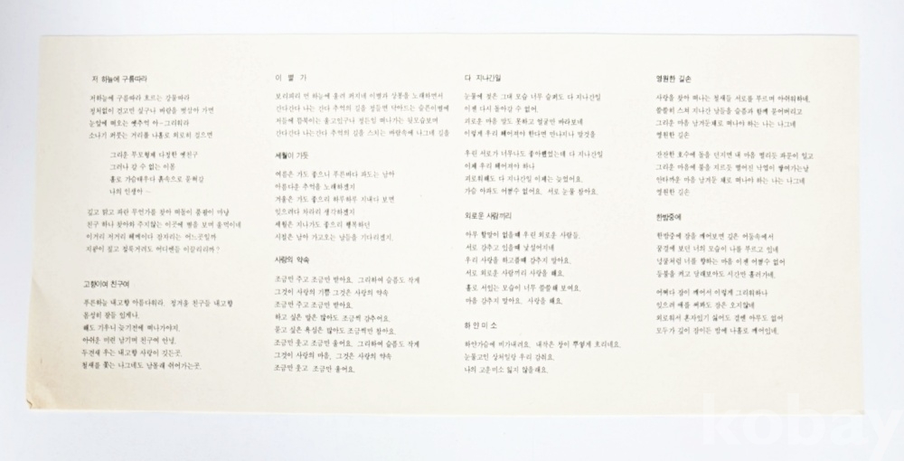 상품 설명 | Side A 1. 저 하늘에 구름따라 2. 영원한 길손 3. 세월이 가듯 4. 한밤중에 5. 하얀미소 Side B 1. 이별가 2. 다 지나간 일 3. 사랑의 약속 4. 고향이여 친구여 5. 외로운 사람끼리 6. 마주보는 눈길마다 (건전가요) | ||