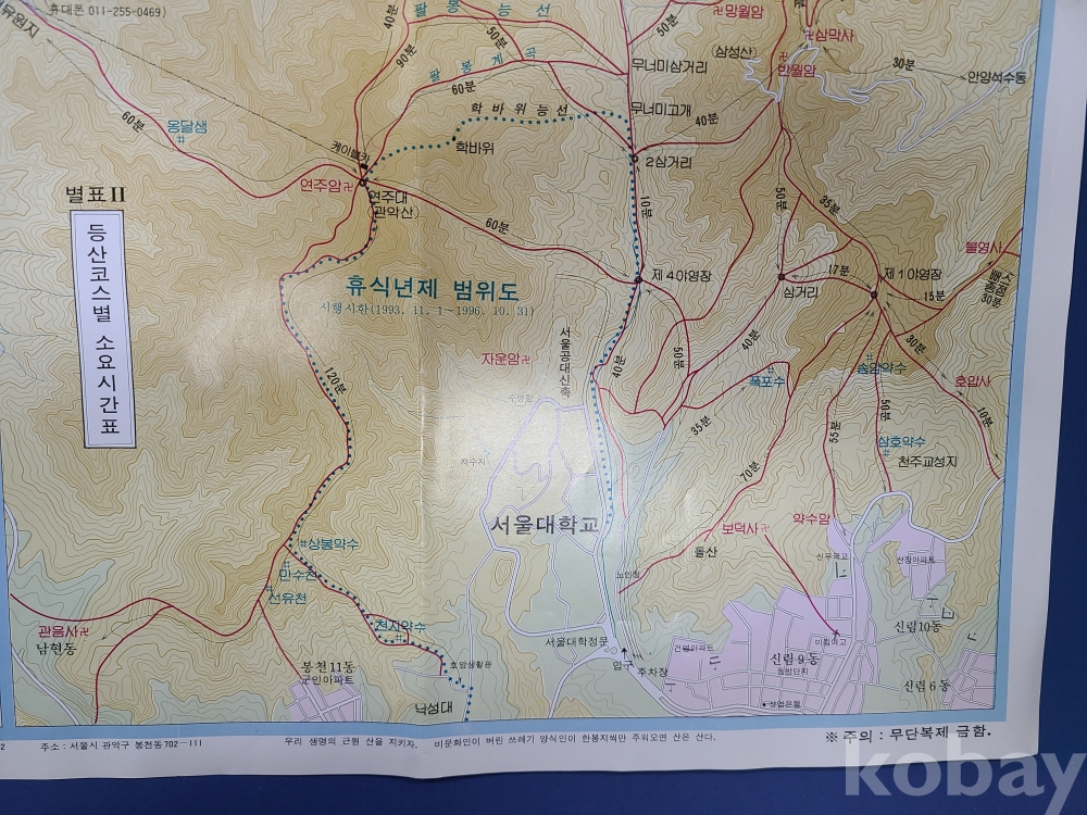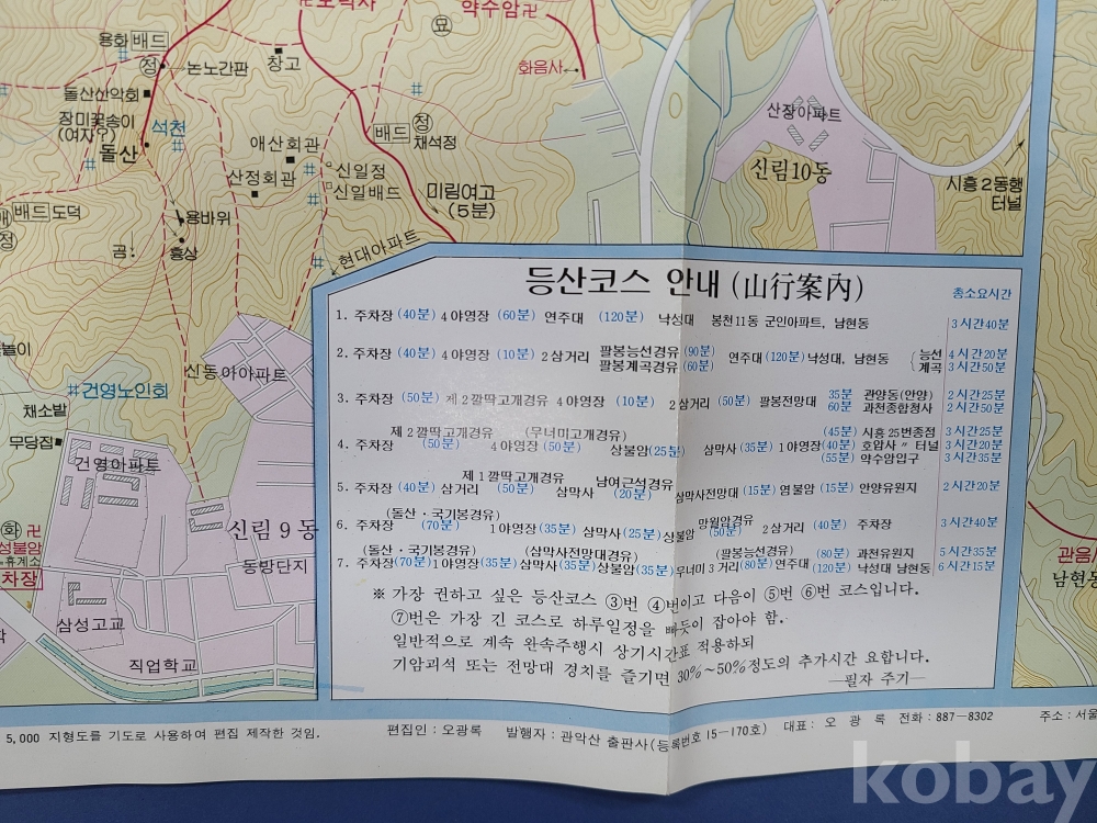 관악산 관광 등산지도/1;5,000 지형도/1993년 발행