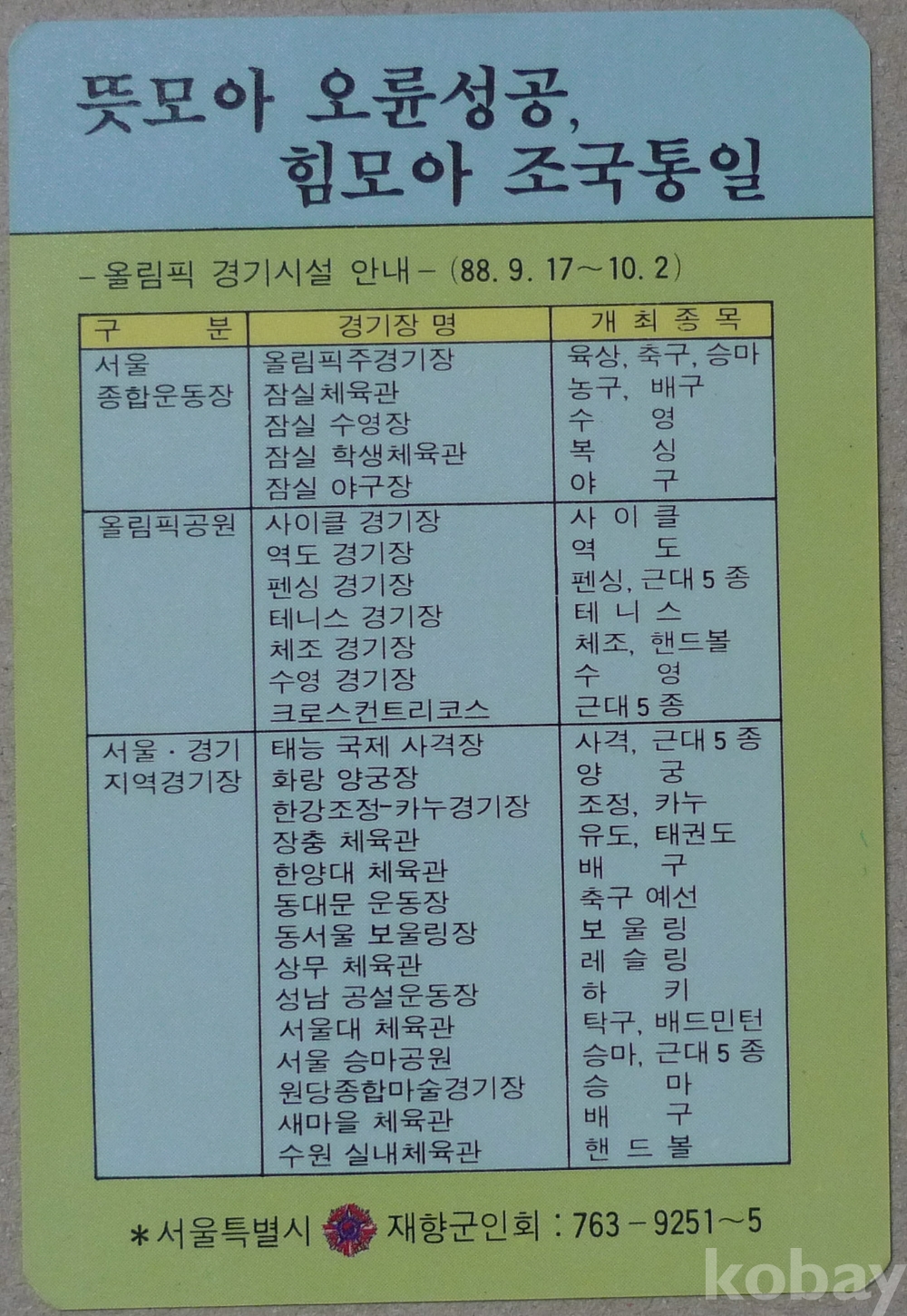 1988년 서울올림픽 경기 시설 안내 포켓 카드