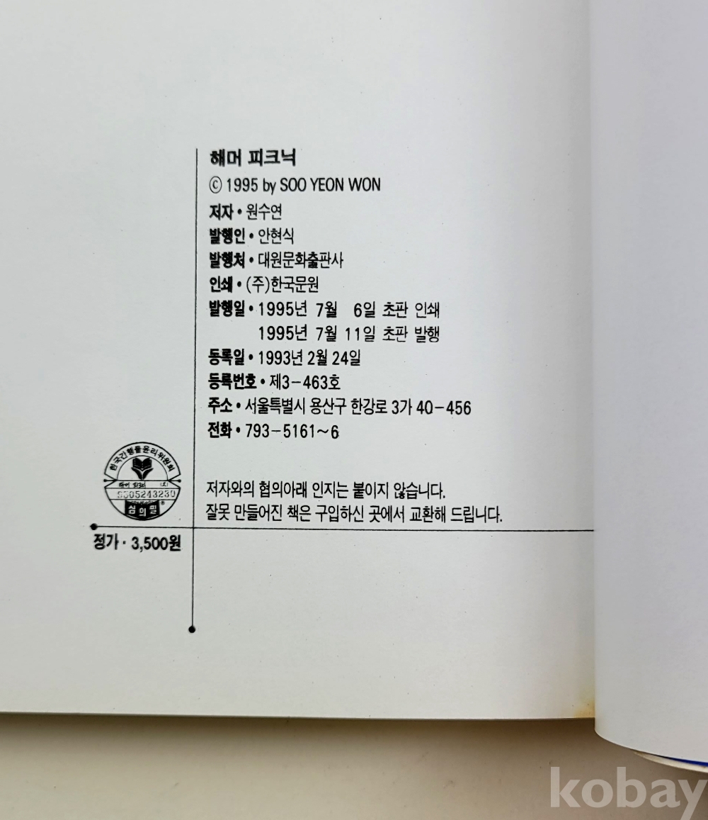 물 품 명 | [스페셜코믹스] 원수연 : 단편집(2) / 해머 피크닉 /1995년 초판 / 대원문화출판사 |