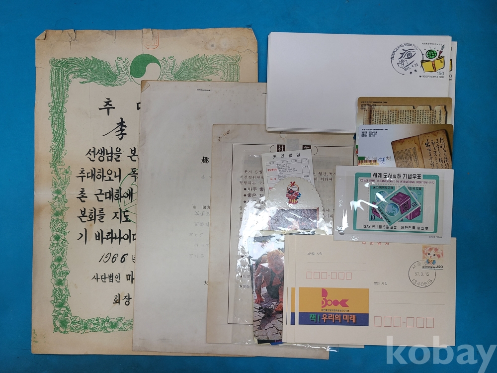**** 책 관련자료 일괄/마을문고진흥회 지도위원 추대장, 책갈피, 리플릿, 대한독서진흥공사 취지문, 책 광고엽서, 책 광고엽서, 책 관련내용이 담긴 전화카드, 세계책과자저작권의날 기념우표 초일봉투, 세계도서의해 기념우표 등 25여점 일괄