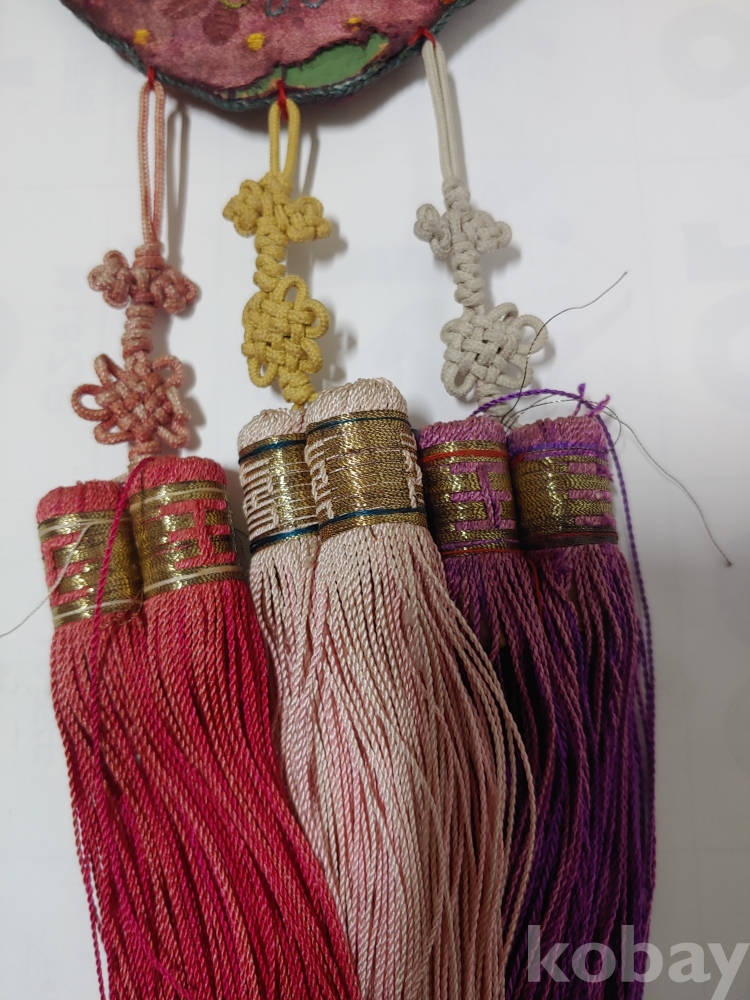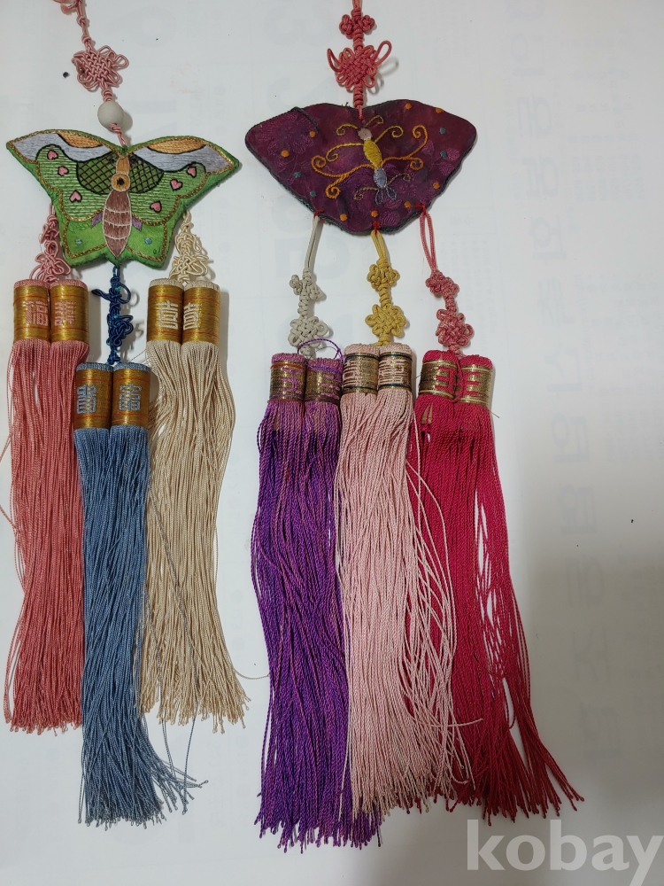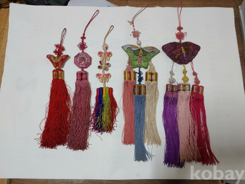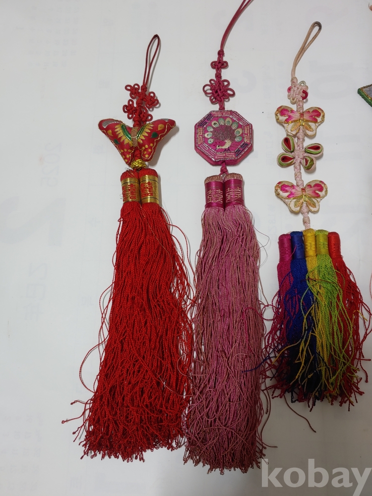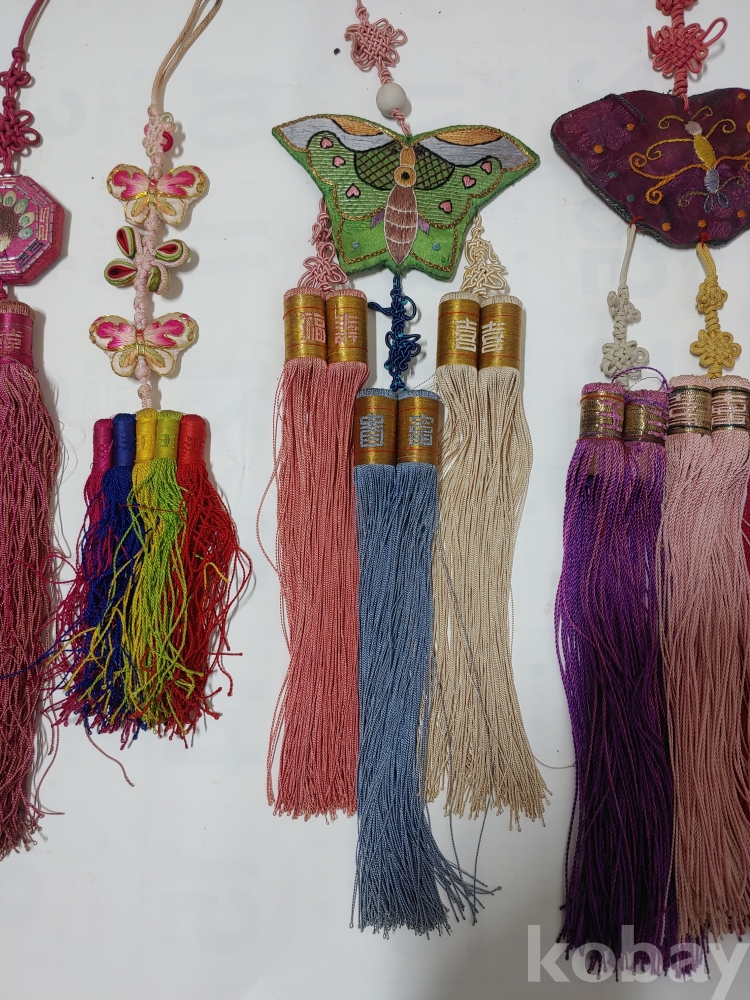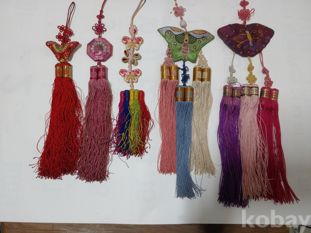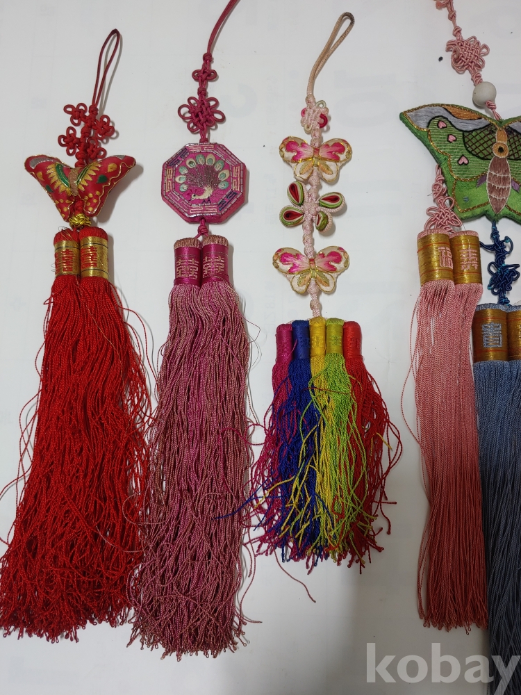 예쁜 모양과 크기가 각각 다른 노리게 매듭 장식품이며