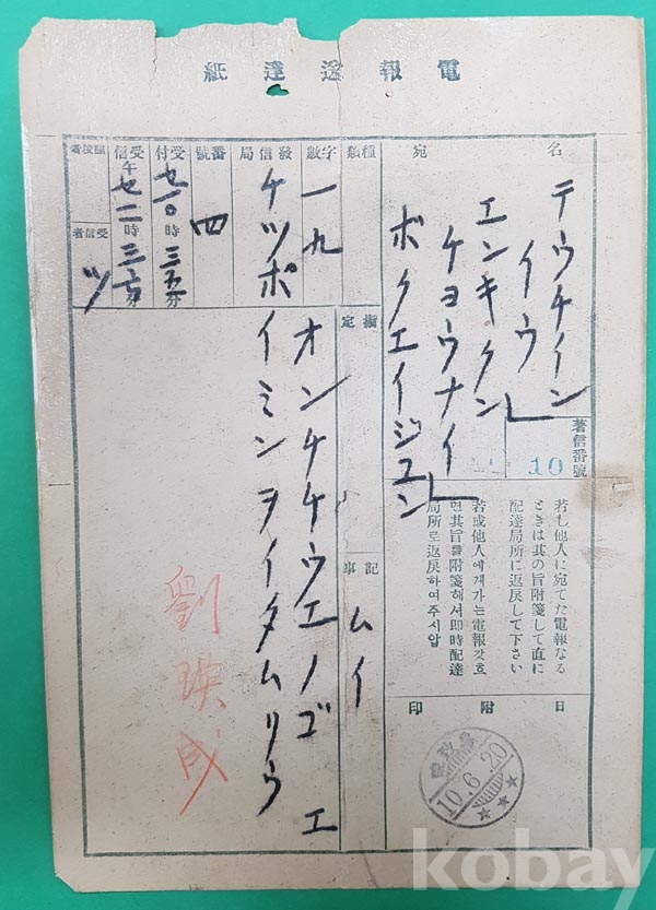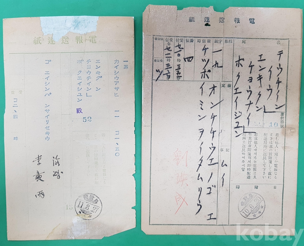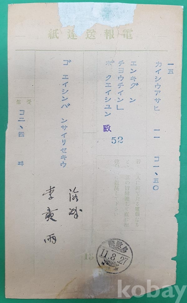 일제강점기 鳥致院우편국 접수 일부인 날인 電報送達紙 (헐은부분 수리를 하였다)