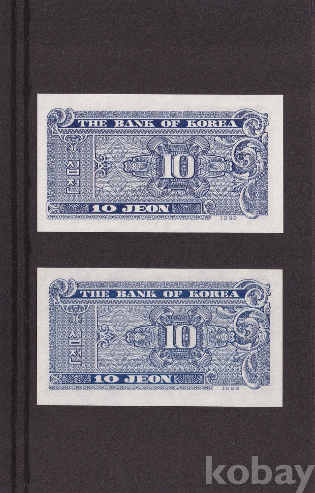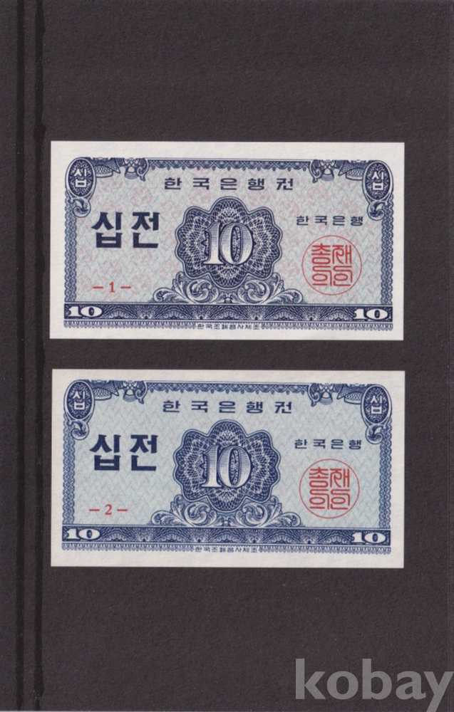 - 한국은행 1962년 소액 십전 판번호 1번 / 2번 미사용 지폐 - 2장 일괄