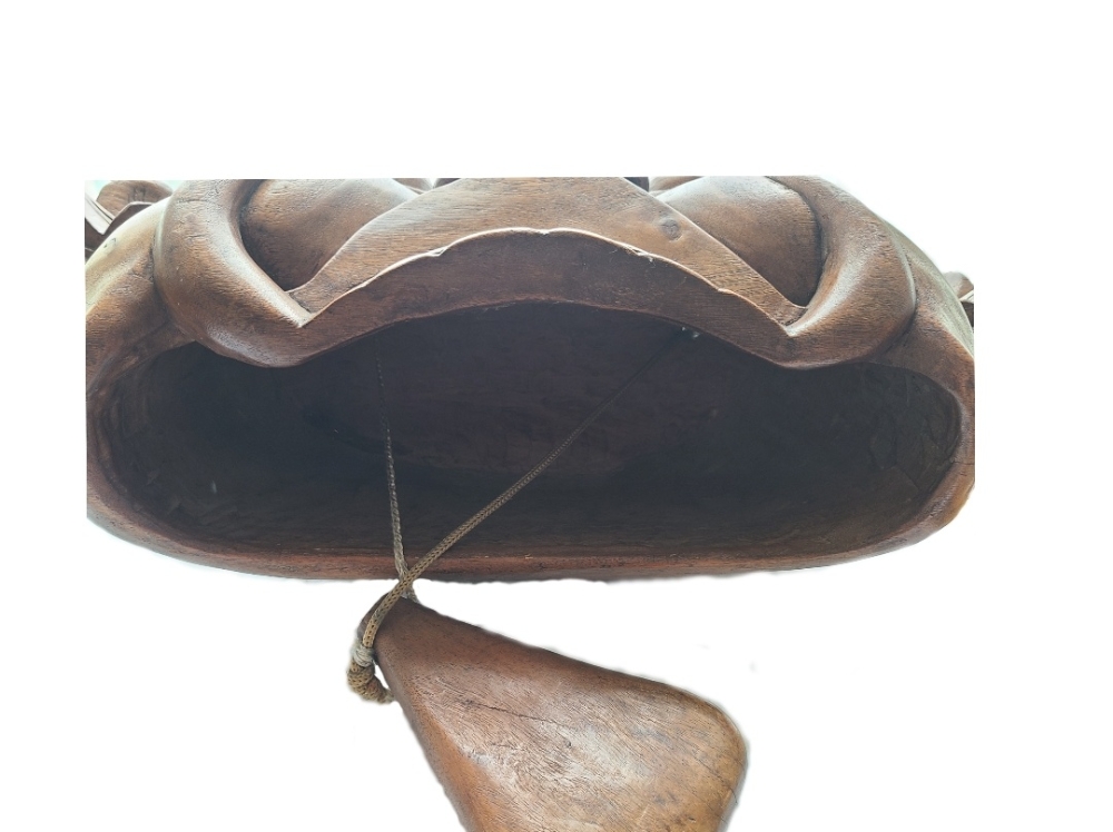 단단한 목재를 깎아 만든 이 종은 정교한 조각 디테일과 함께, 내부는 비어 있고 타구(종추)가 매달려 있어 실제로 울림이 가능합니다.