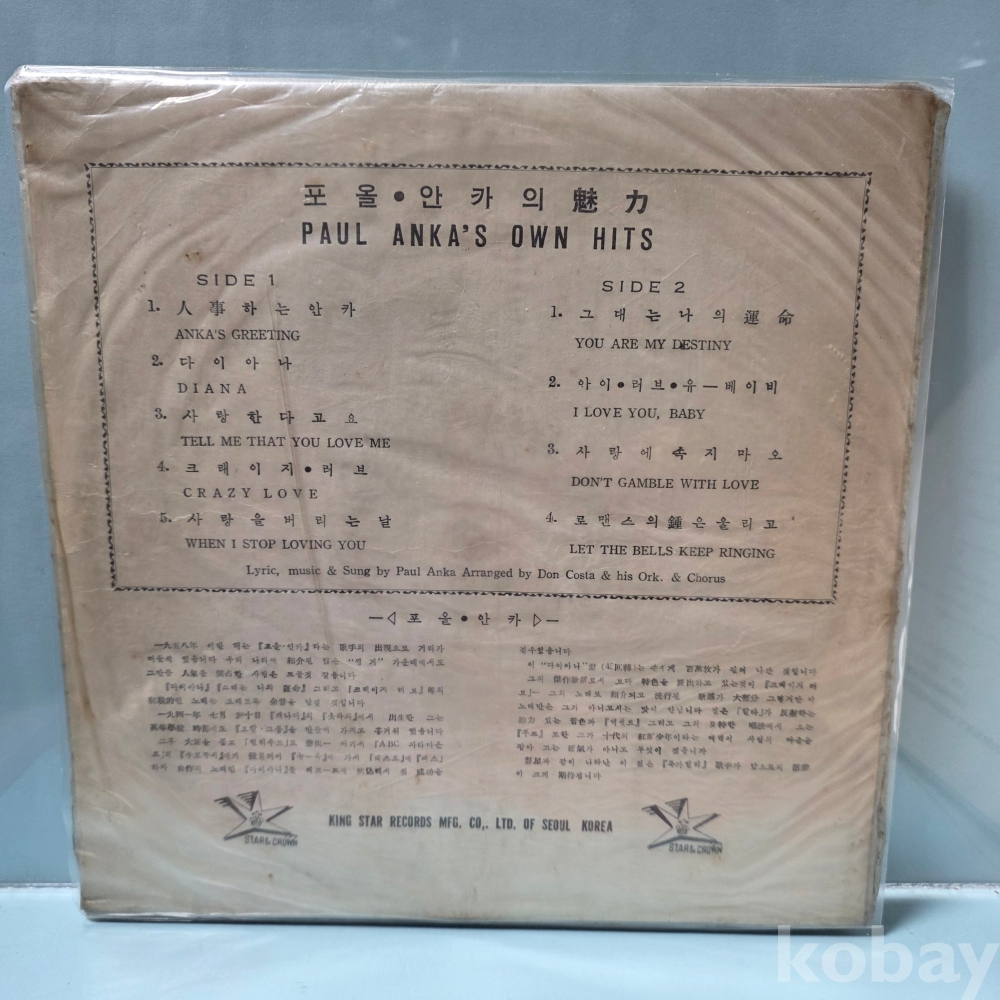 상품 설명 | Side A 1. 인사하는 안카 (Anka's Greeting) 2. 다이아나 (Diana) 3. 사랑한다고요 (Tell Me That You Love Me) 4. 크레이지 러브 (Crazy Love) 5. 사랑을 버리는 날 (When I Stop Loving You) Side B 1. 그대는 나의 운명 ( You Are My Destiny) 2. 아이 러브 유, 베이비 (I Love You, Baby) 3. 사랑에 속지마오(Don't Gamble With Love) 4. 로맨스의 종은 울리고 (Let The Bells Keep Ringing) |