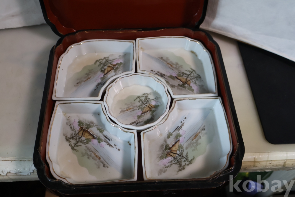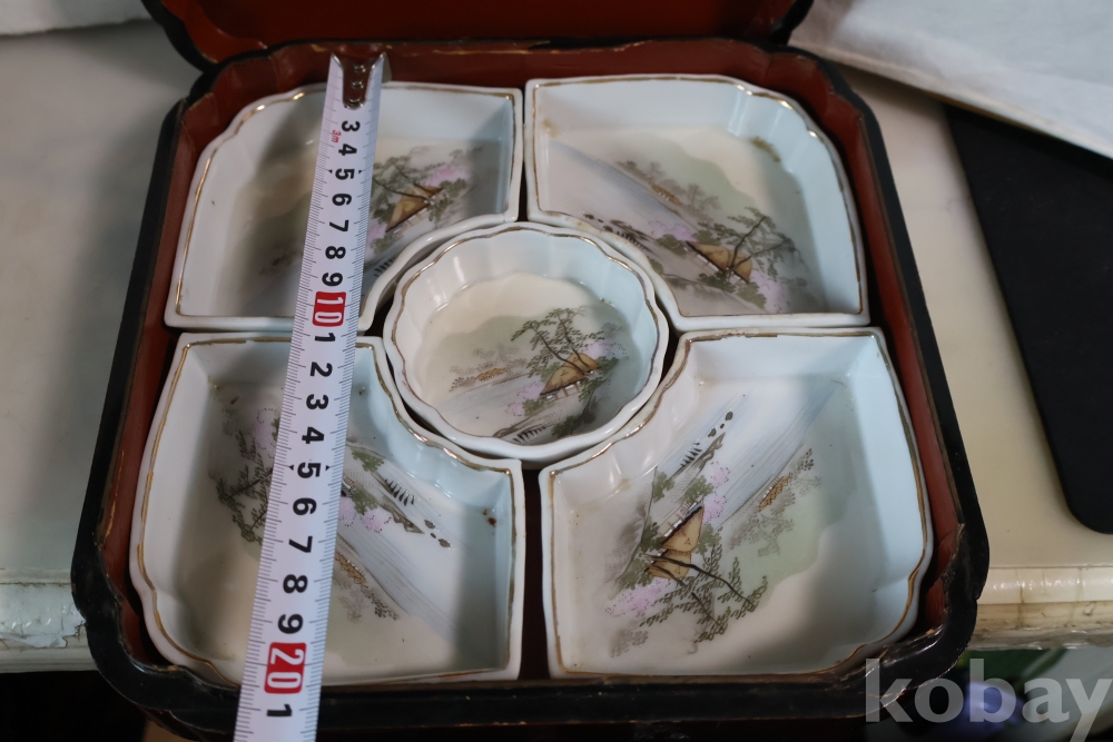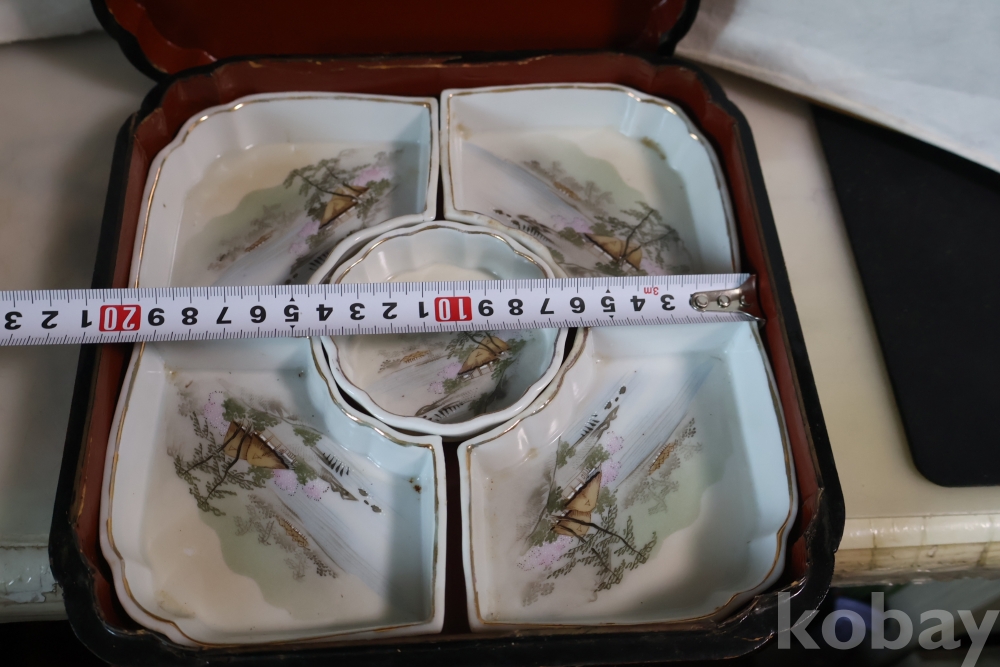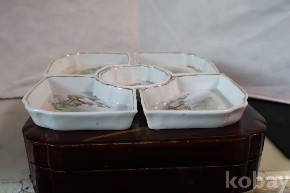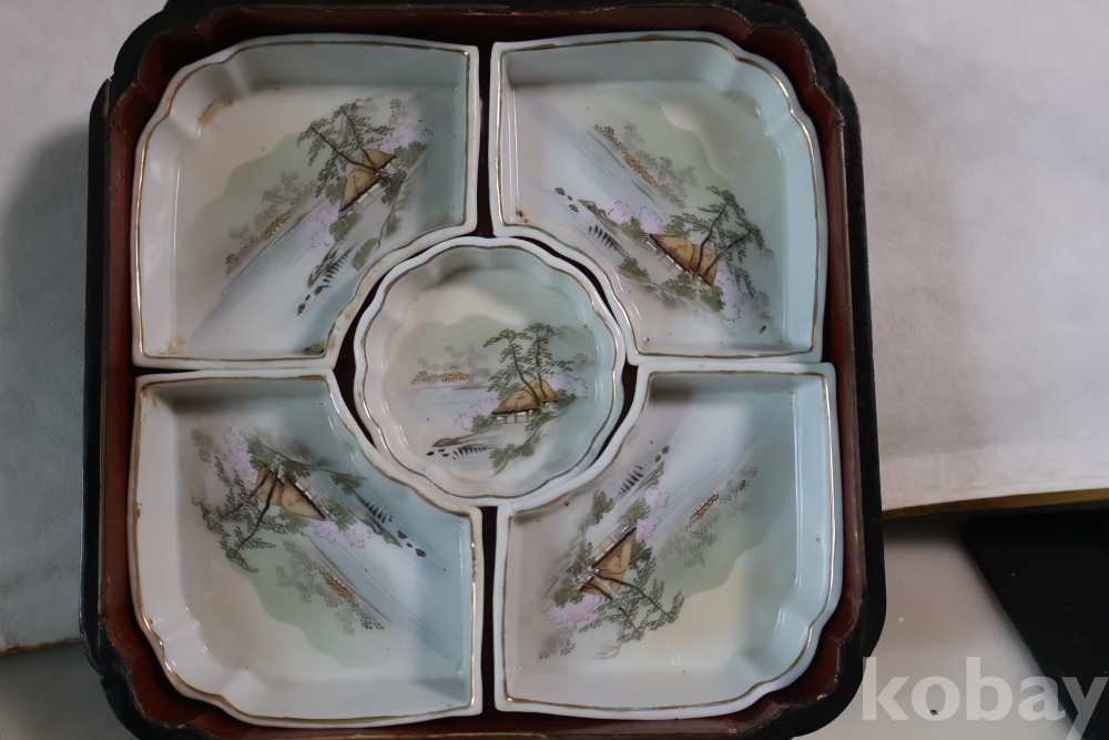 칠기 상자를 가진 귀한 도자기 세트 임니다 멋진 디자인 그림을 가진 1920대의 명품 임니다 칠기는 세월의 흔적을 가진 명품 세트 임니다 한개는 제살 붙침이 보임니다 8번 사진