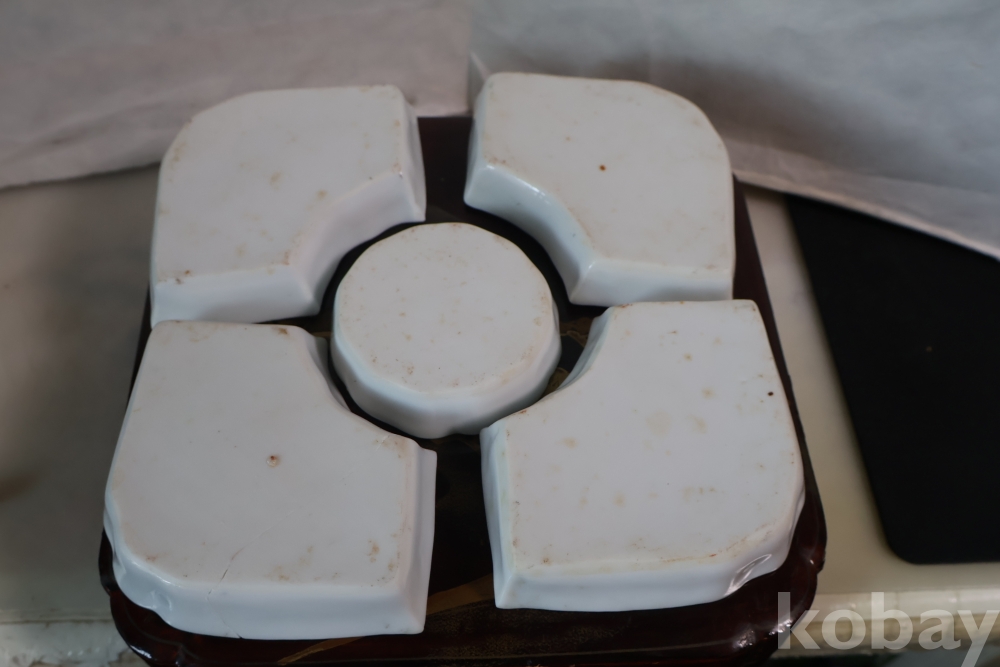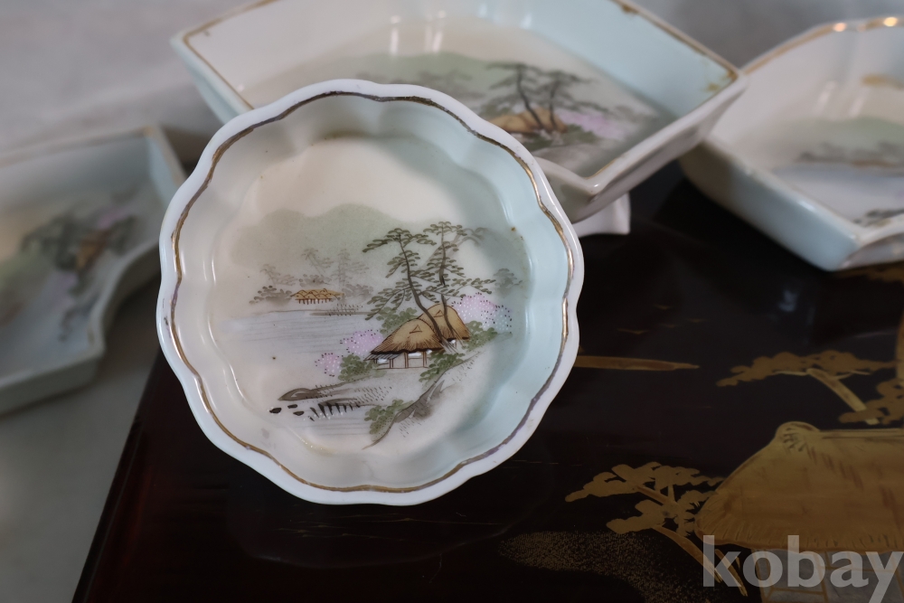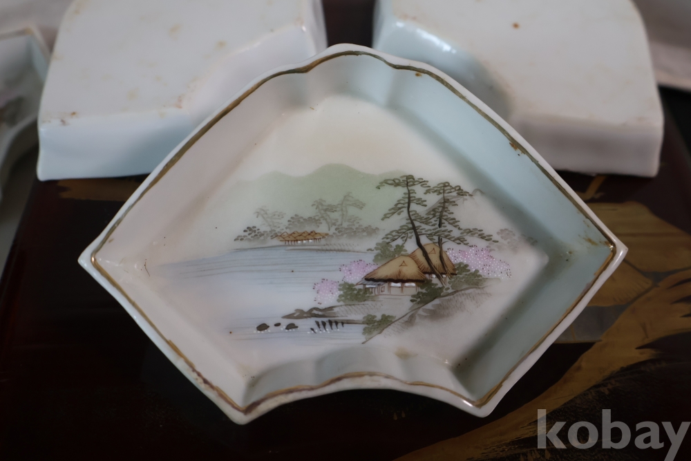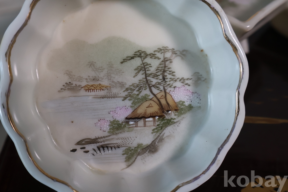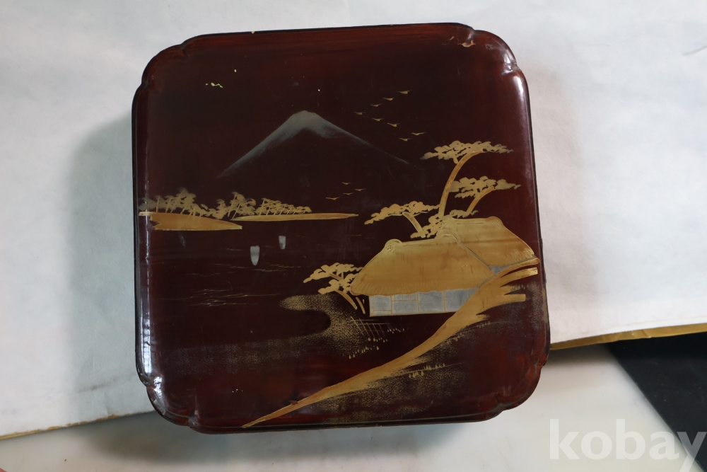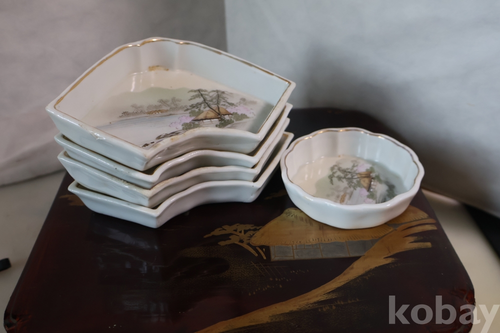 칠기 상자를 가진 귀한 도자기 세트 임니다 멋진 디자인 그림을 가진 1920대의 명품 임니다 칠기는 세월의 흔적을 가진 명품 세트 임니다 한개는 제살 붙침이 보임니다 8번 사진