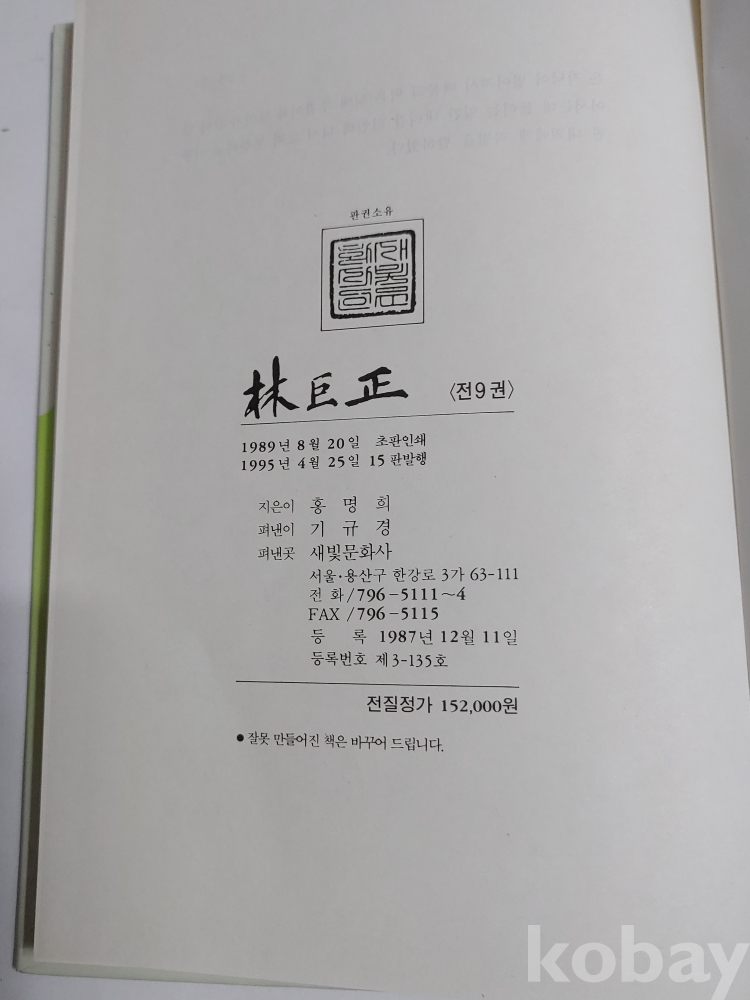 ★천원출발★ L-12-009 역사대하소설 임꺼정 9권(겉 박스 파손, 묶음배송불가, 착불배송)