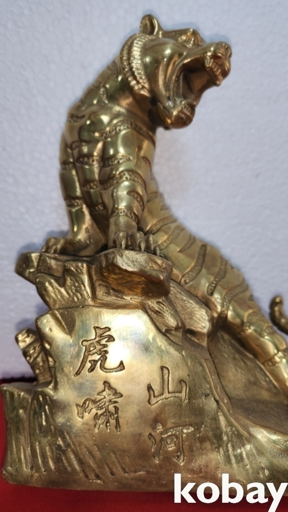 건륭연제(乾隆年製) 관지 산하호소(山河虎嘯) 황동 괴석에서 표호하는 호랑이 상입니다,