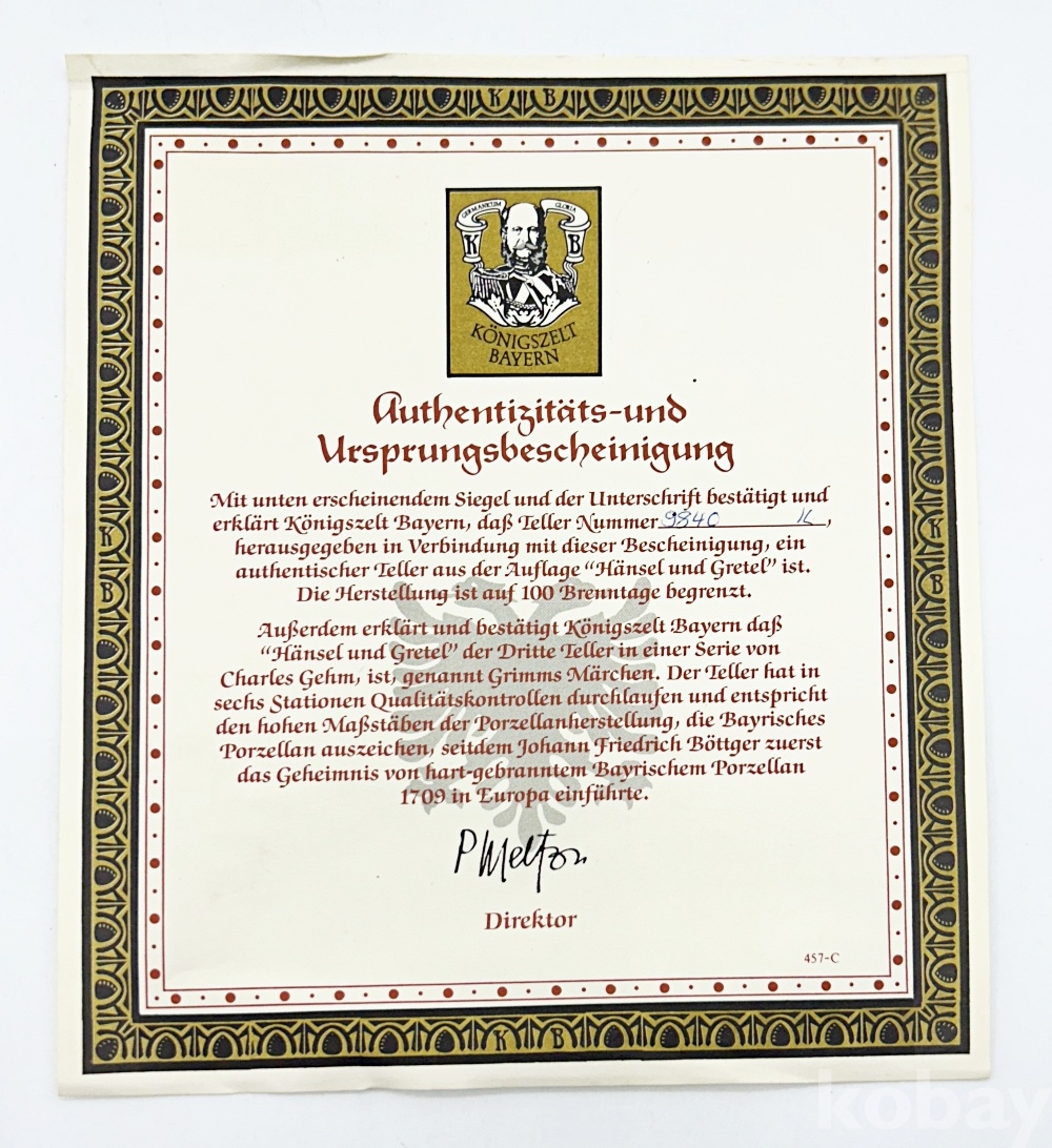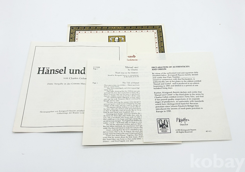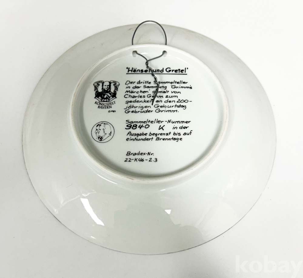 상품설명 | 쾨니히스첼트 바이에른에서 한정판으로 제작한 그림 형제 탄생 200주년 기념 접시이다. 독일 아티스트 찰스 겜(Charles Gehm)의 그림 형제 동화 시리즈 중 3번째 접시로 '헨젤과 그레텔(Hänsel und Gretel)' 속 장면이 그러져 있다. 박스 24.5 x 24 cm, 접시 19.8 x 19.8 cm / 보증서 1부, 설명서 3부 | ||
