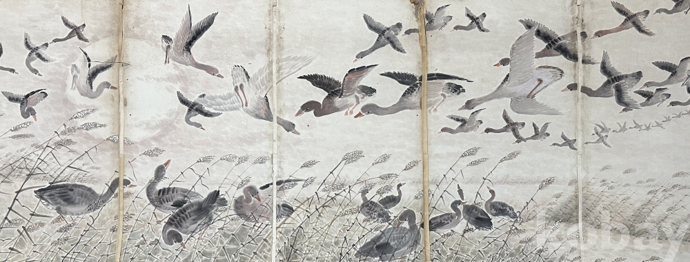이 작품은 성재 이희열의 대표적인 수묵담채 작품으로, 넓은 갈대밭 위를 날아오르는 기러기 떼의 비상을 그린 ‘雁群圖(안군도)’입니다. 화면 전면에는 바람에 흔들리는 갈대가 섬세하게 묘사되어 있고, 그 위로 수십 마리의 기러기가 대열을 이루며 하늘로 날아오르는 장면이 펼쳐집니다. 회색과 담홍색의 조화로운 채색이 은은하며, 수묵의 농담으로 표현된 기러기의 생동감과 공기의 흐름이 탁월하게 드러납니다. 여백과 번짐을 적절히 활용하여 깊이 있는 공간감을 구현하였고, 붓질의 속도감과 필선의 유려함이 뛰어난 수준을 보여줍니다. 작품 전체는 평온함 속에서도 생명력과 역동성이 공존하는 남종화 특유의 정취를 잘 담아내고 있습니다. 5장의 그림이 이어져 구성되어 있습니다.