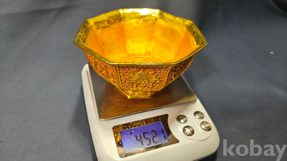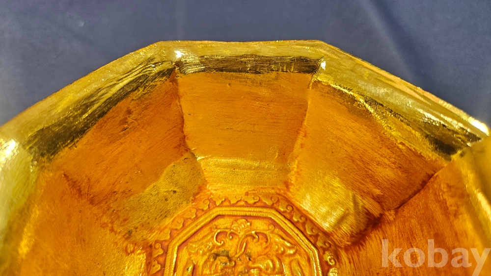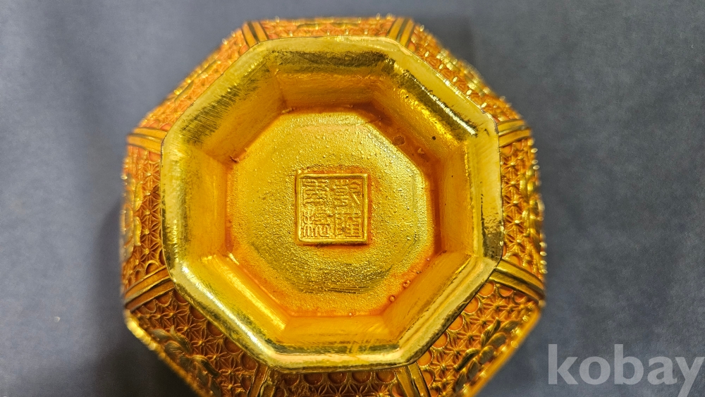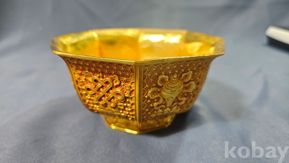 외부에도 문양이 화려하게 들어있는 금동 팔각 다완입니다.