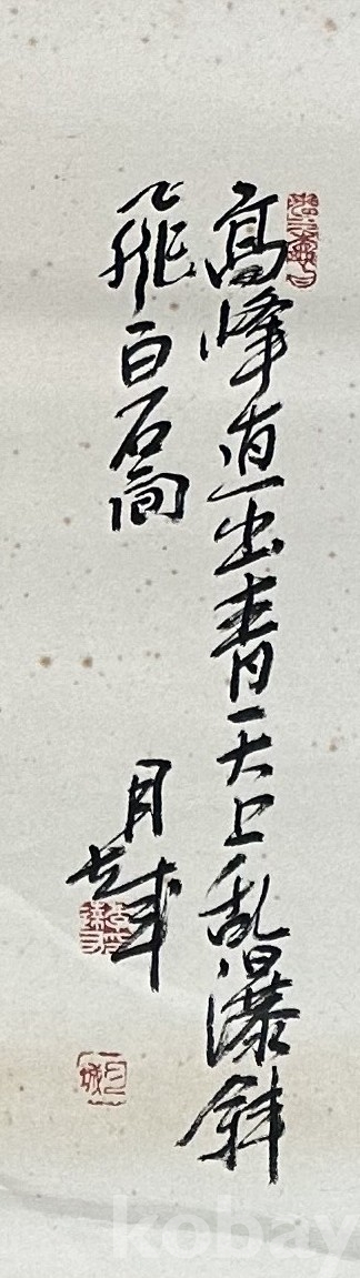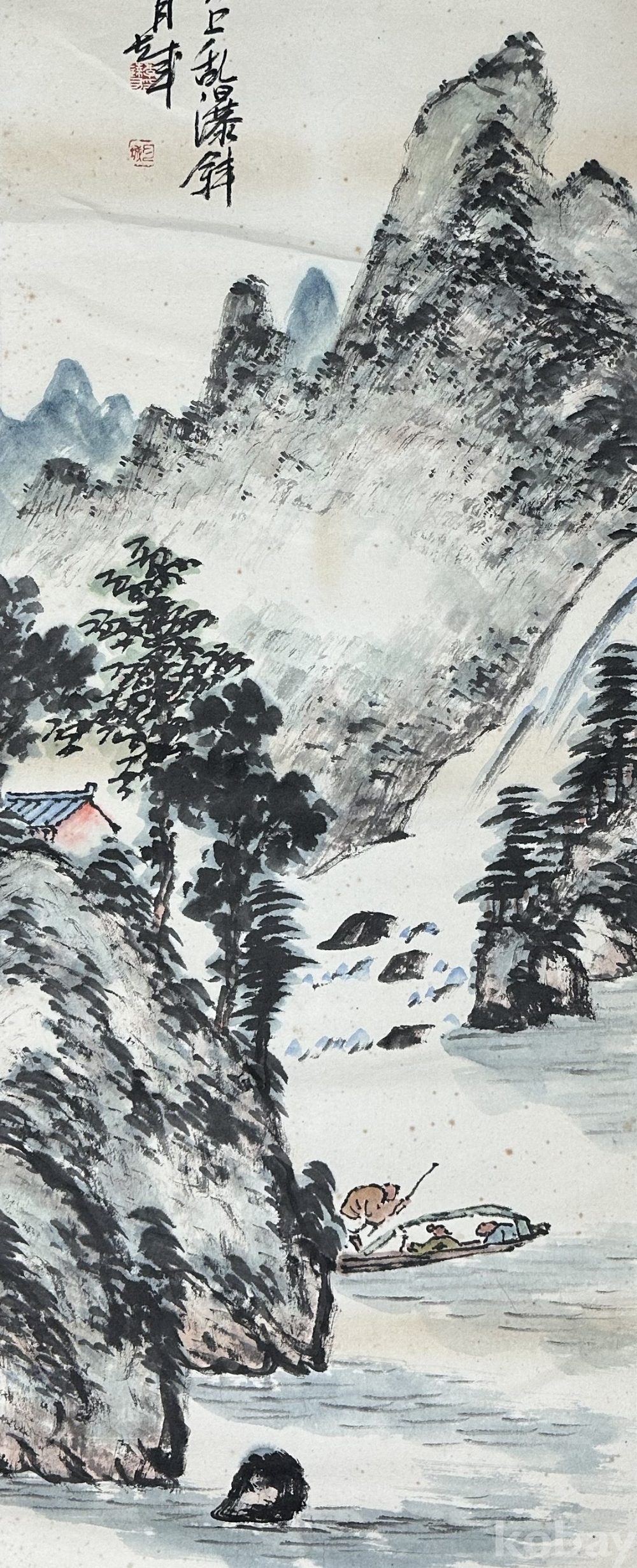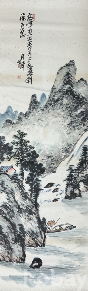 이 작품은 높은 산세와 물길이 어우러진 전통 산수화로, 잔잔한 물 위의 작은 배와 기암 절벽, 그리고 수목 사이의 조용한 정취가 담겨 있습니다. 먹의 농담을 섬세하게 조절하여 산의 중후함과 안개 낀 듯한 운무의 느낌을 잘 표현했으며, 붓질의 속도감과 채색의 절제된 사용이 조화를 이루고 있습니다. 상단의 제발과 낙관이 더해져 완성도를 높였으며, 전체적으로 안정된 구도와 부드러운 색감이 돋보이는 작품입니다.