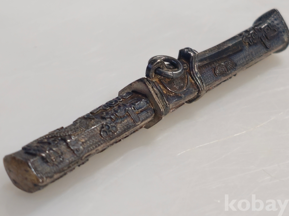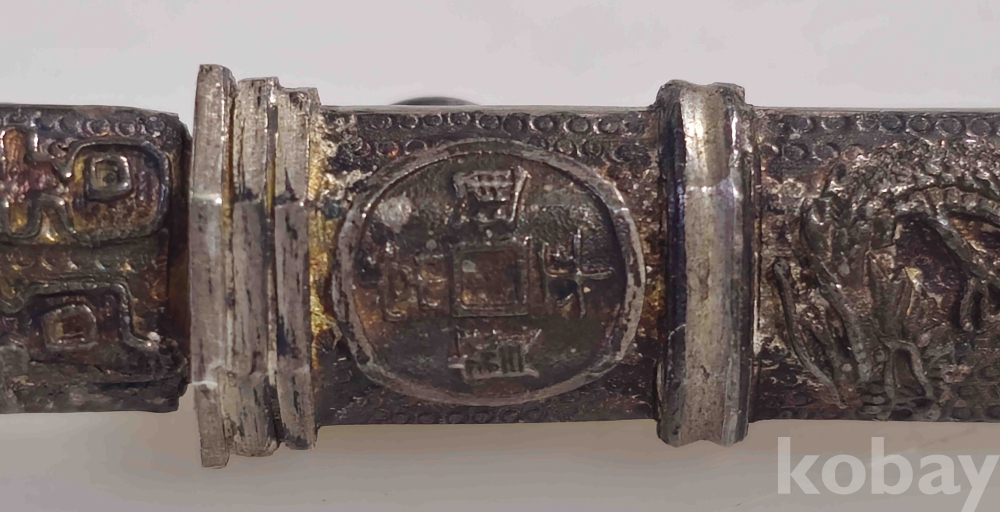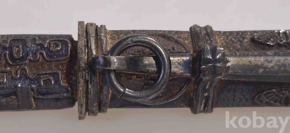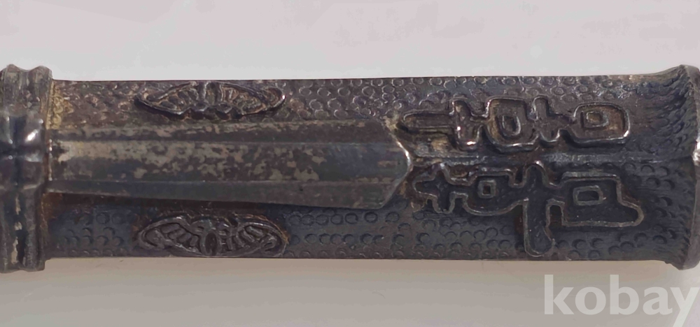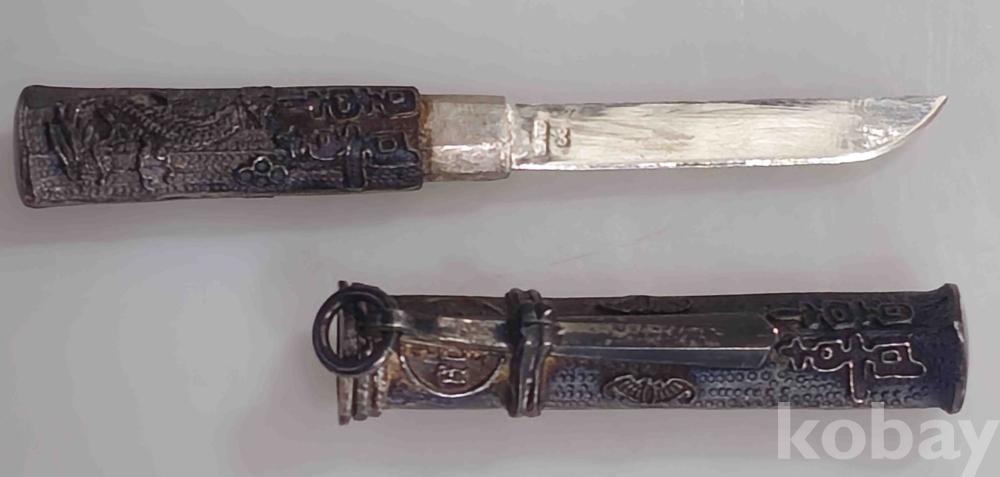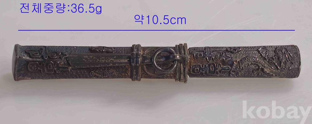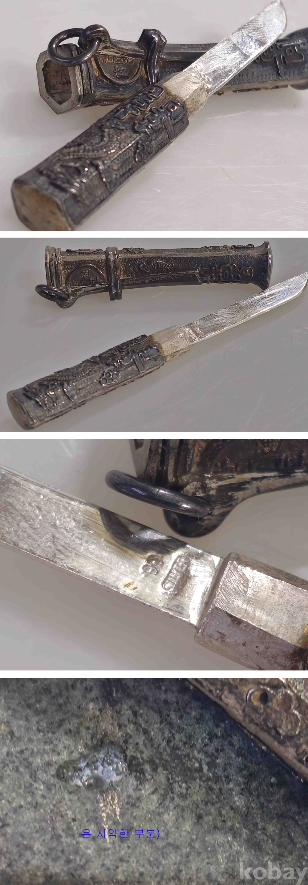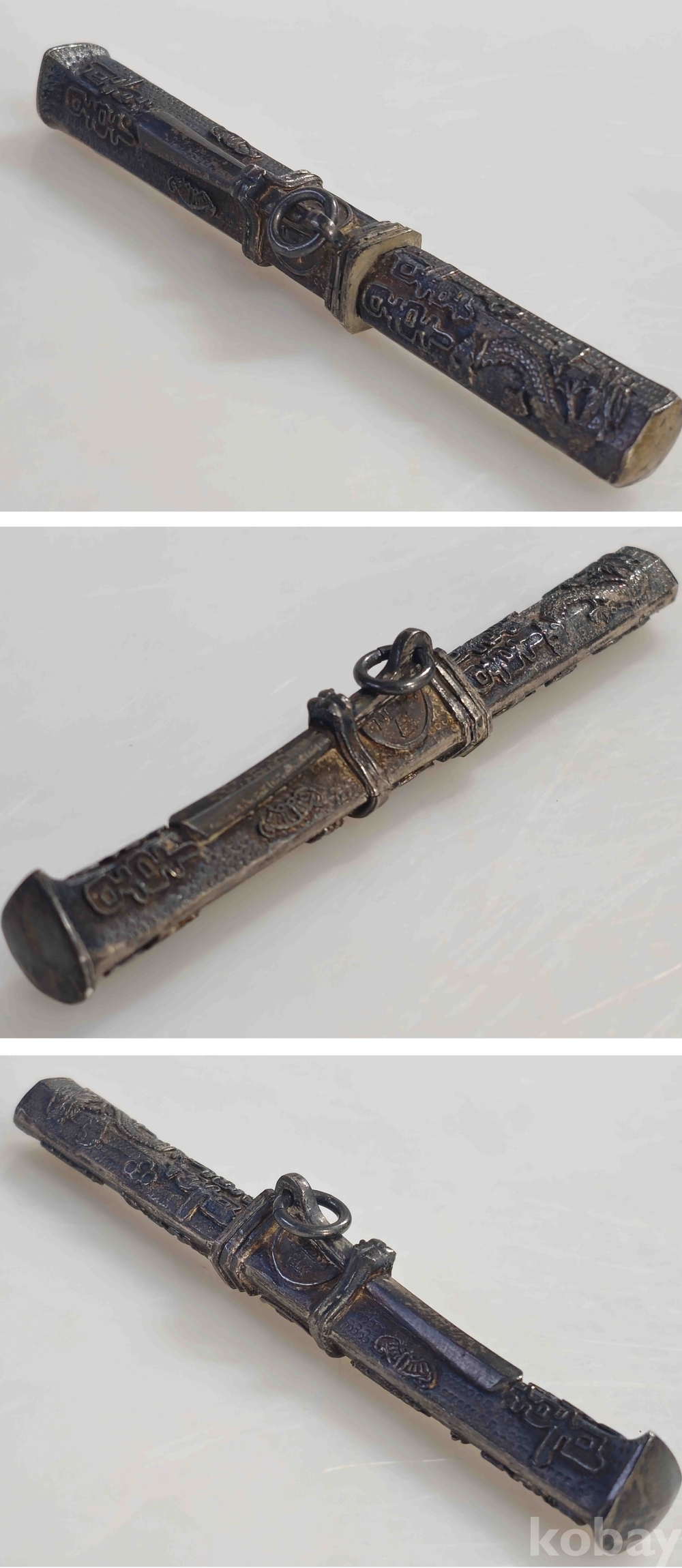 상품 설명 | 연대감 좋은 순은 양각 용문 은장도입니다. 수리없이 상태양호하며 양각으로 용과 명문을 시문하여 기물의 격을 높였습니다. 칼날까지 순은 입니다. 맨 끝의 사진은 은시약을 한 사진입니다. 참고로 사진은 확대한 상태이며 설명 못한 부분은 사진으로 대체합니다. 흔한 기물이 아니기에 소장의 가치가 높습니다. | ||