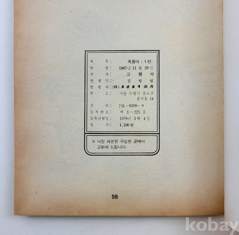 물 품 명 | 고행석 / 폭풍아 (1~15)완결 총15권 / 타이거문고 / 1987년 초판 / 소년한국도서 |