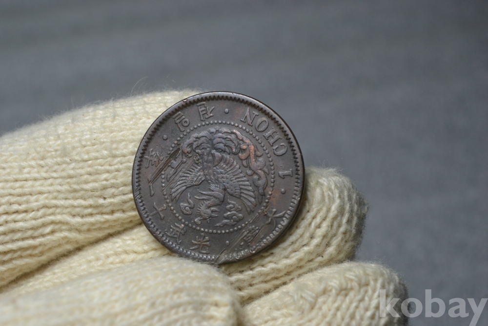 " 매우 귀한종류(작은 휘어짐 표면긁힘 상태~) ".. " 대한 광무11년(1907년) 소형 봉황 1전(일전) 청동화 " .. 이화장 진품~ 조선말 구한국 근대전 ~