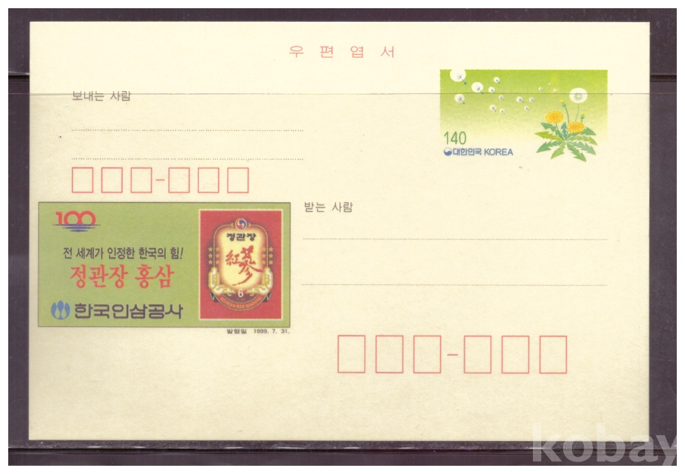 (광고엽서) 1999.7.31 지방판 LAPC360 한국인삼공사 (민들레 140원)