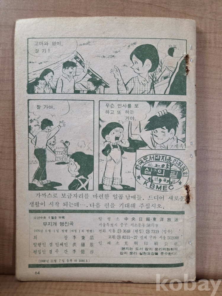 이두호 <무지개 행진곡> 제5권. 소년중앙 1976년 6월호 부록입니다.