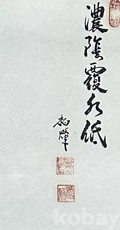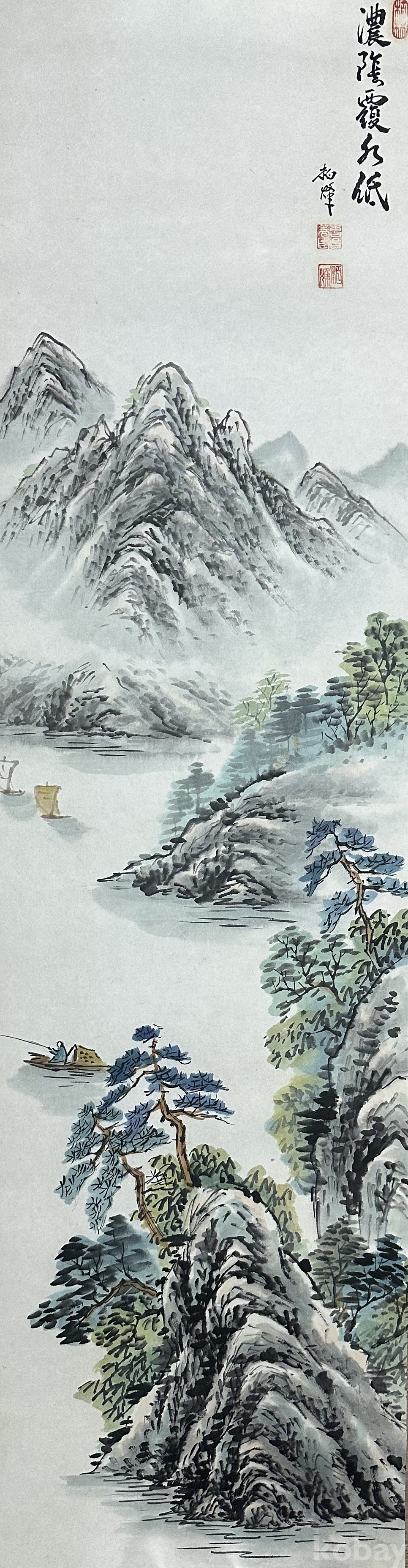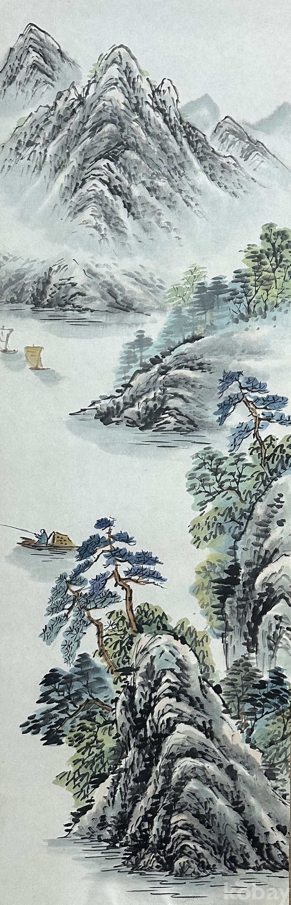 본 작품은 잔잔한 강 위에서 낚시를 즐기는 인물을 중심으로, 안개에 감싸인 산과 나무, 그리고 멀리 떠 있는 배들을 담은 전통 산수화입니다. 수묵과 청록의 은은한 번짐이 조화를 이루며, 산세의 깊이와 수면의 고요함을 세밀하게 표현했습니다. 상단의 제발과 낙관을 통해 문인화풍의 전통 구도를 따르고 있으며, 필치가 섬세하고 안정감 있습니다. 전체적으로 차분하면서도 깊은 분위기를 전해주는 감상용 근현대 산수화로, 자연의 정취를 담백하게 담고 있습니다.