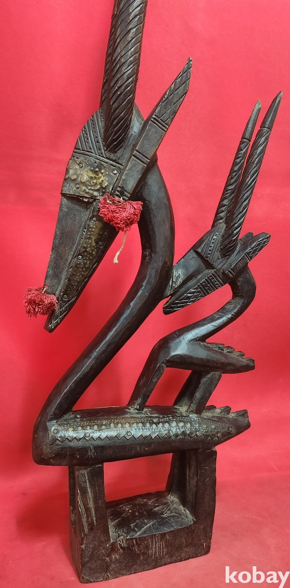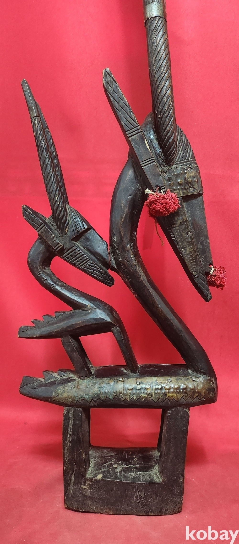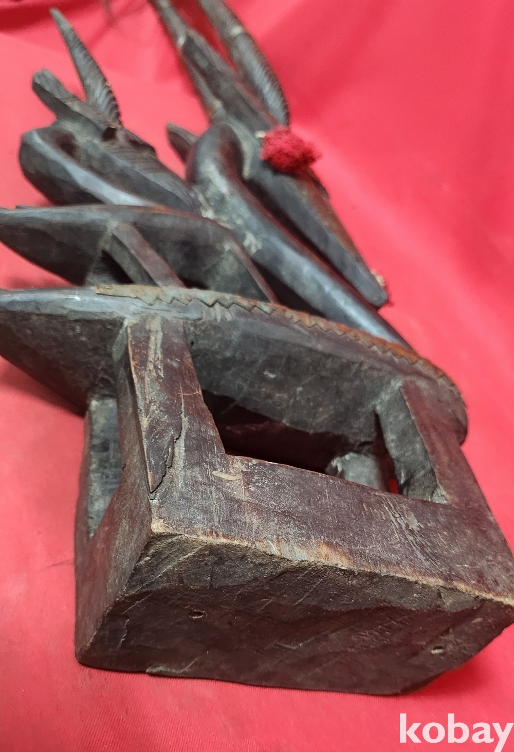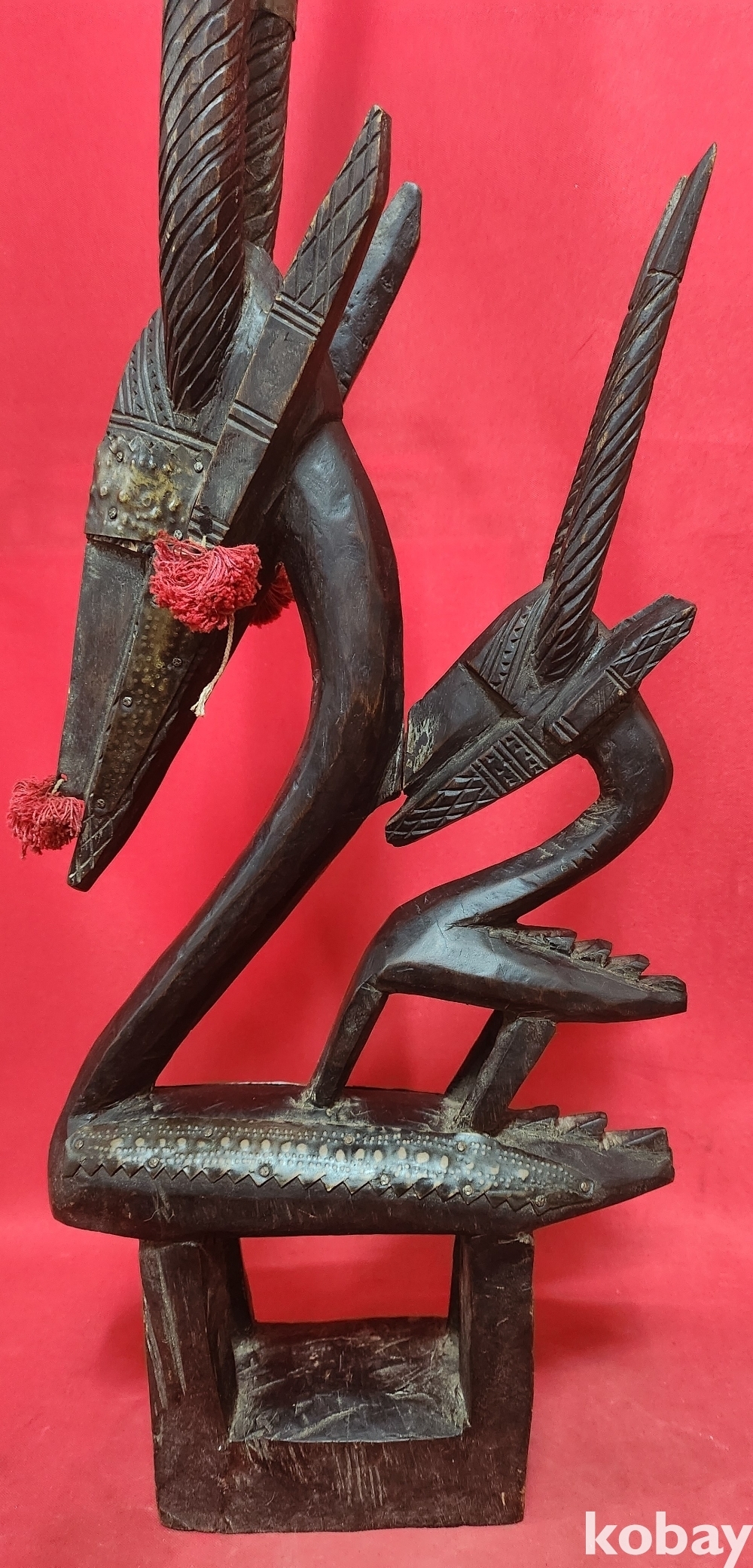 붉은색 나무에 동으로 감싼 동물형상 조각품입니다,