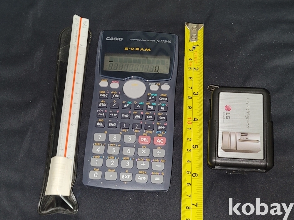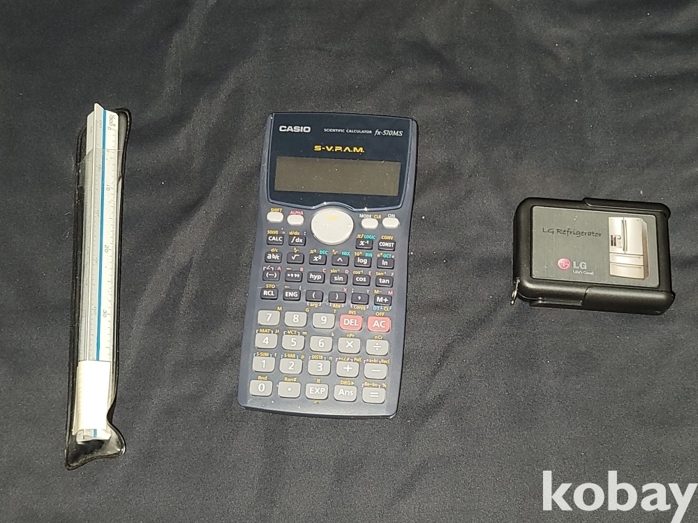 빈티지 카시오 전자계산기 fx-570MS, LG 사은품 삐삐 모양 줄자, 자 등 3종 일괄입니다.