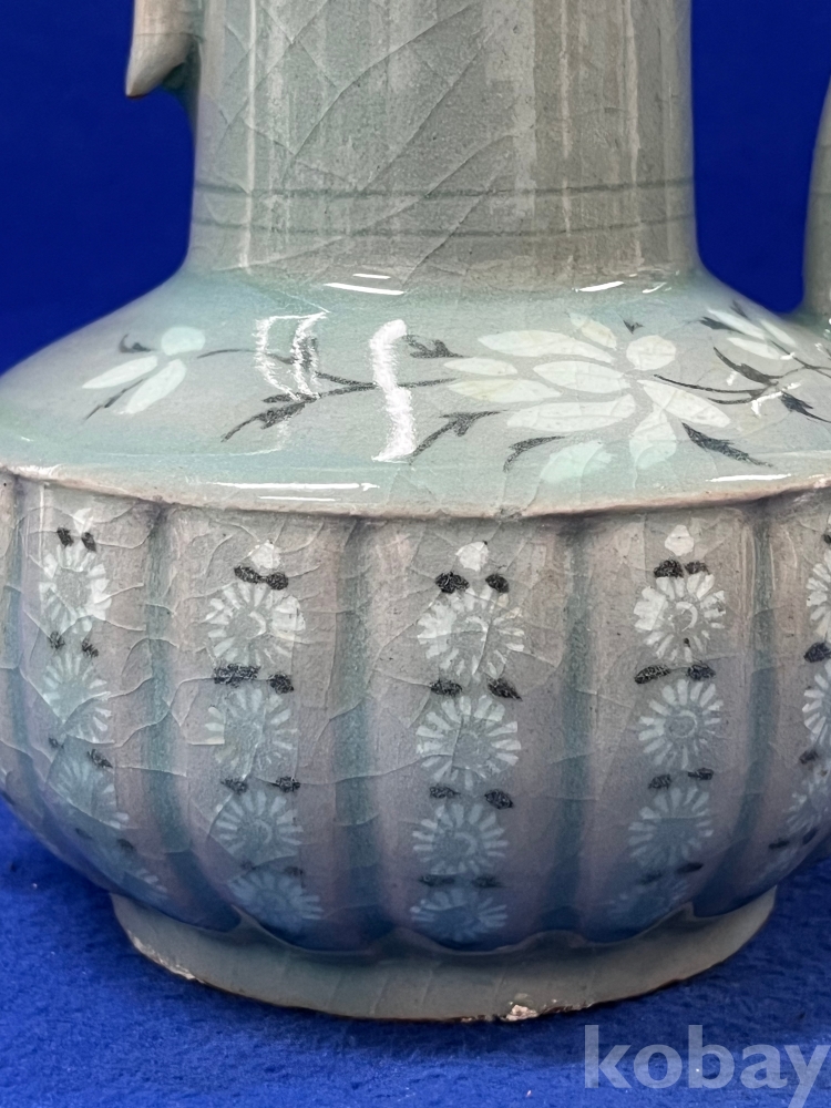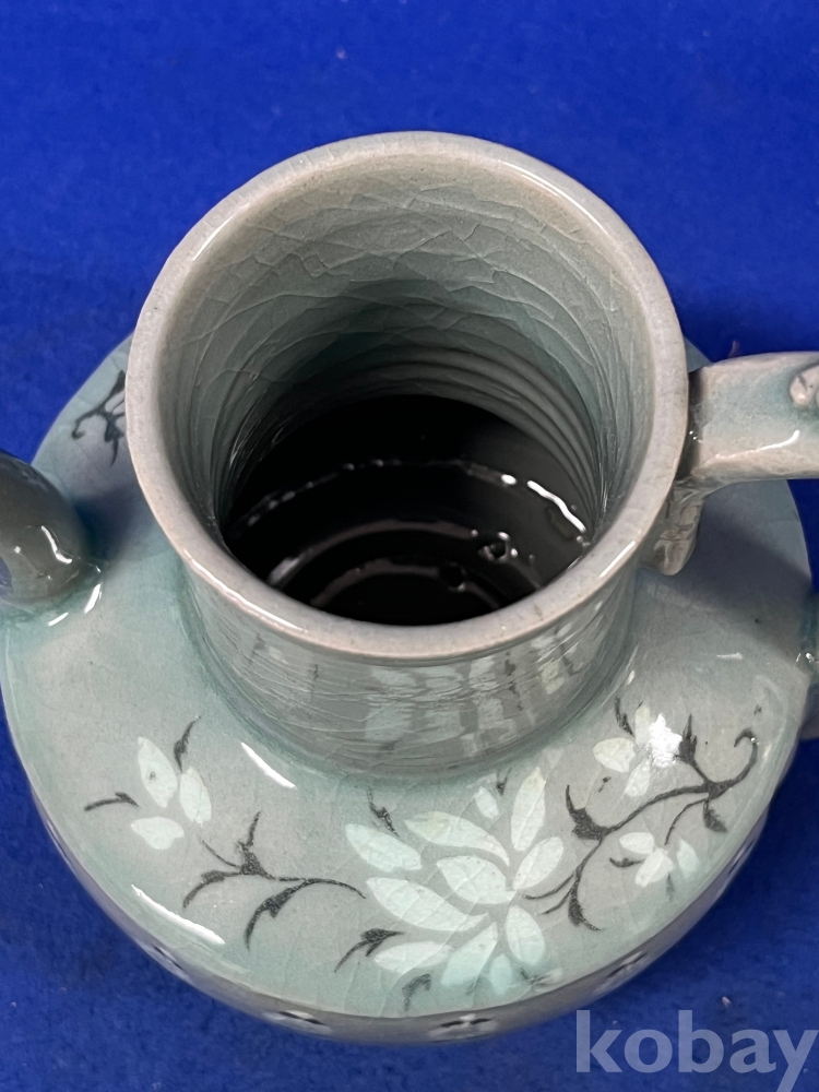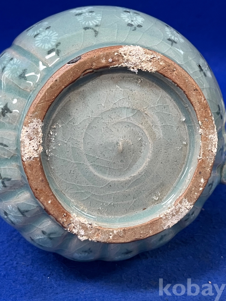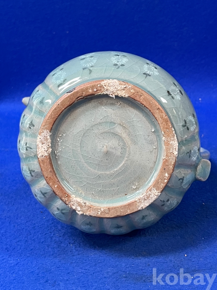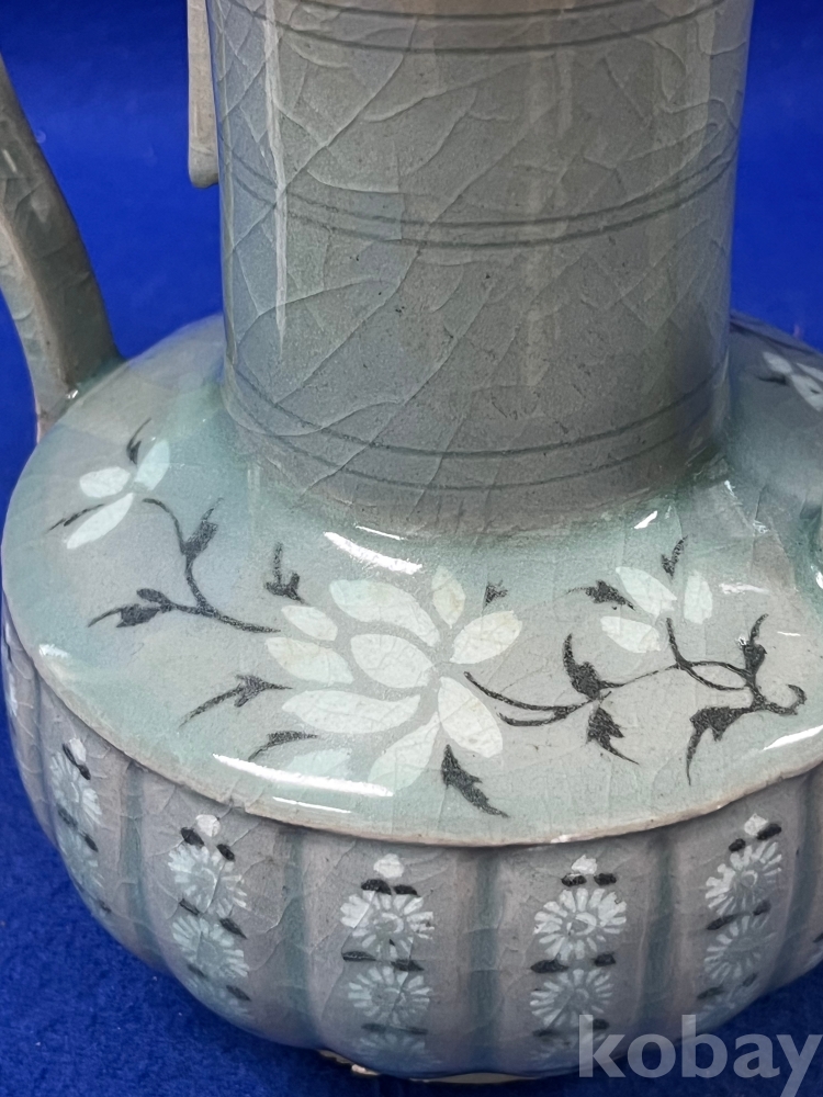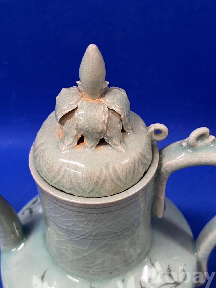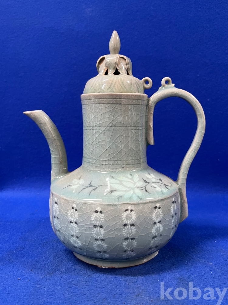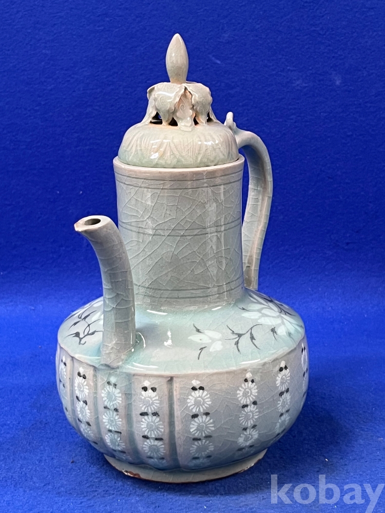 이 주자는 부드럽고 은은한 비색의 유약 위에 상감기법으로 국화문을 장식한 청자입니다.