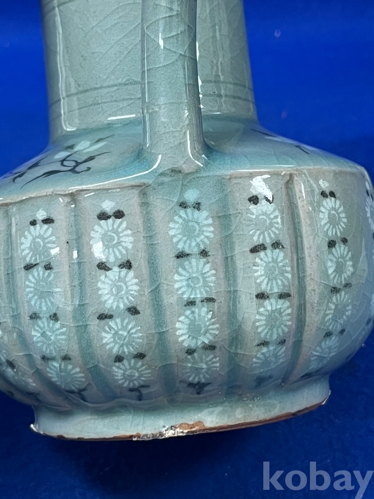 몸체 하단에는 흰색과 흑색 상감으로 국화문을 규칙적으로 배열하였고,