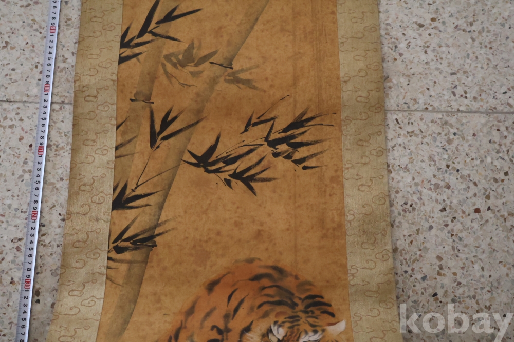 일본 미술 호랑이 족자 고태미를 가진 멋진 호랑이 족자 이며 초생달 대나무 의 배경을 가진 명화 임니다 세월의 흔적을 가진 명화 이며 화가의 낙관이 보심?? 명품 임니다 전체 길이는 203+ -