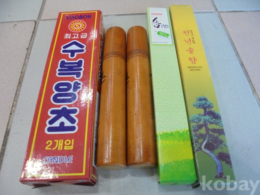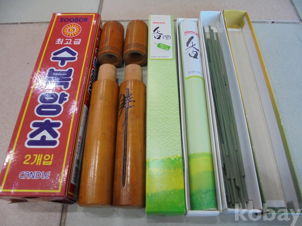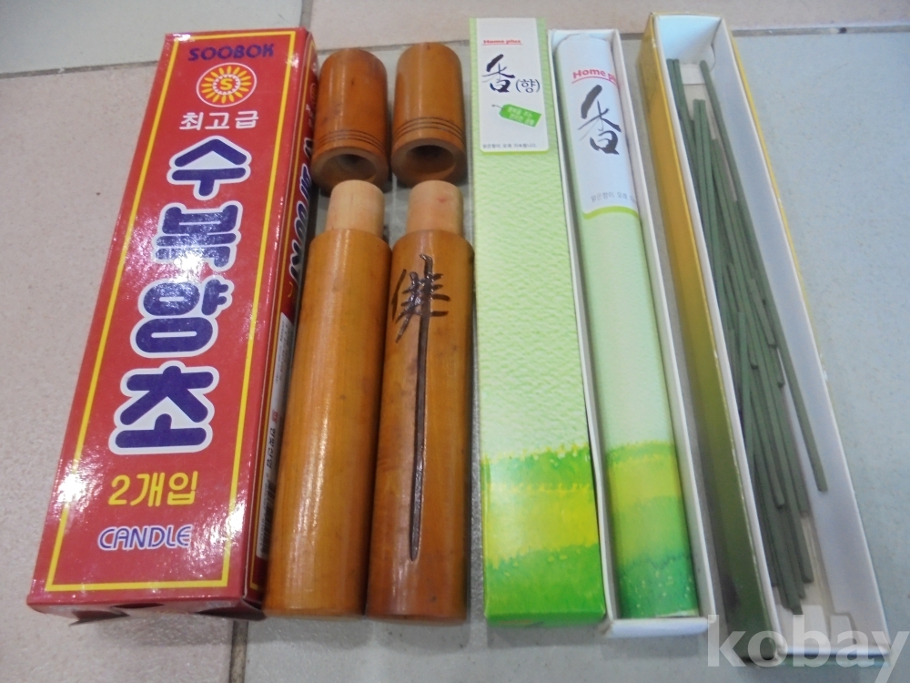 불자가 들어간 잘만든 나무향통 2점과 수복양초 1갑 막대기 향 2갑인데 1갑만 온전한것 나머지는사용하다남은것임