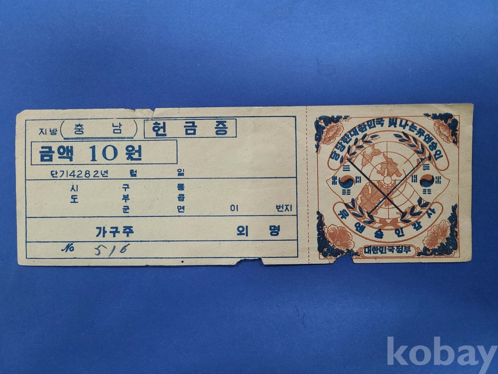 1949년 유엔승인감사 충남 헌금증/10원